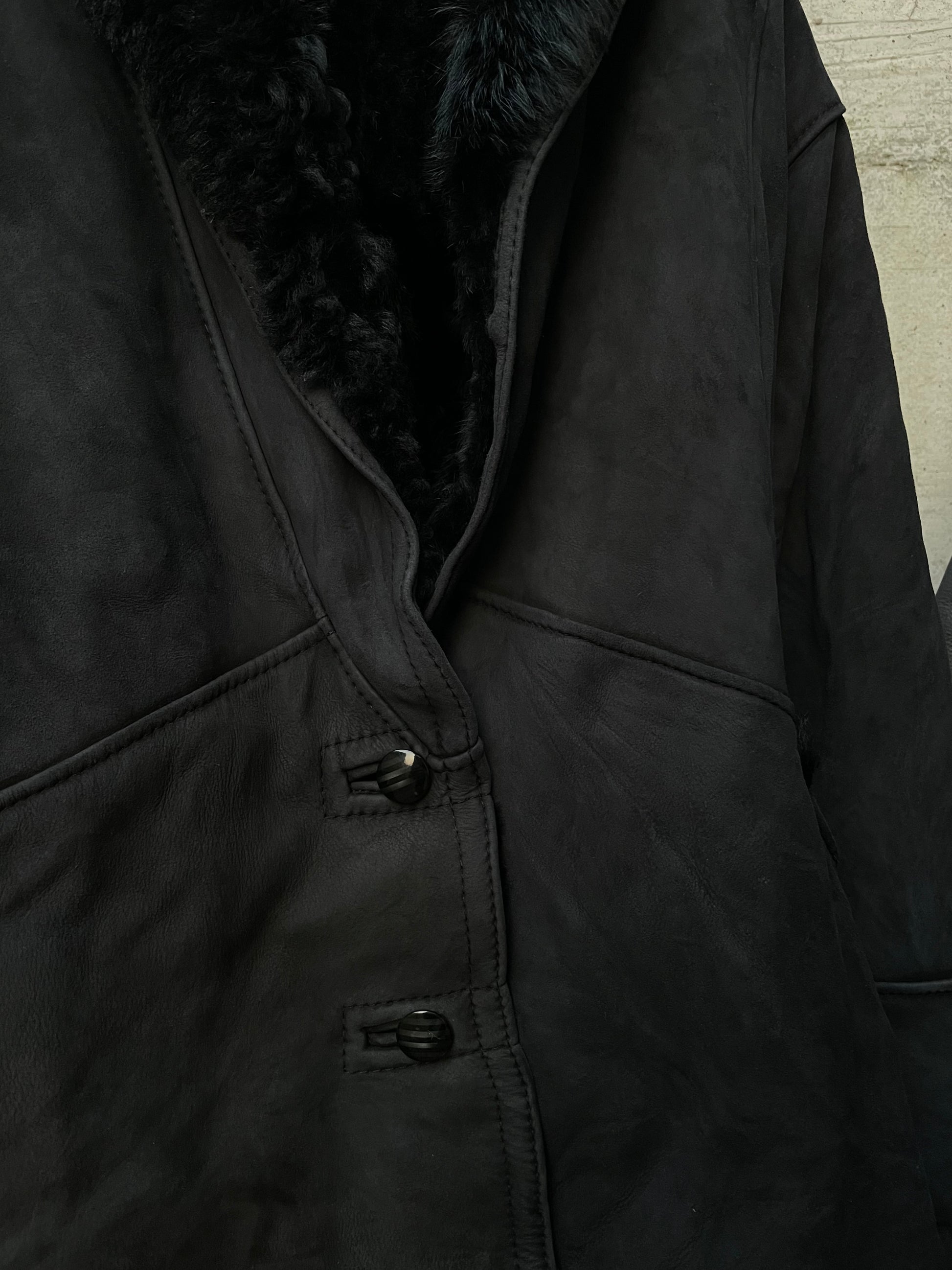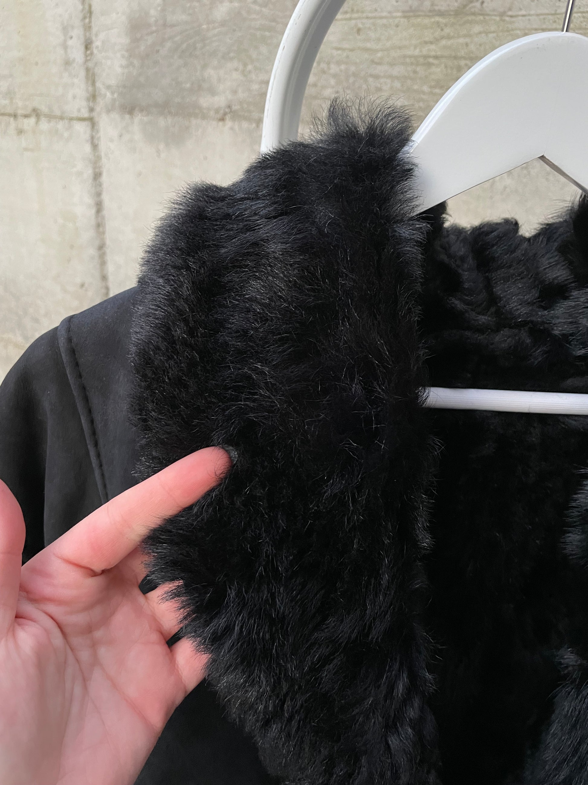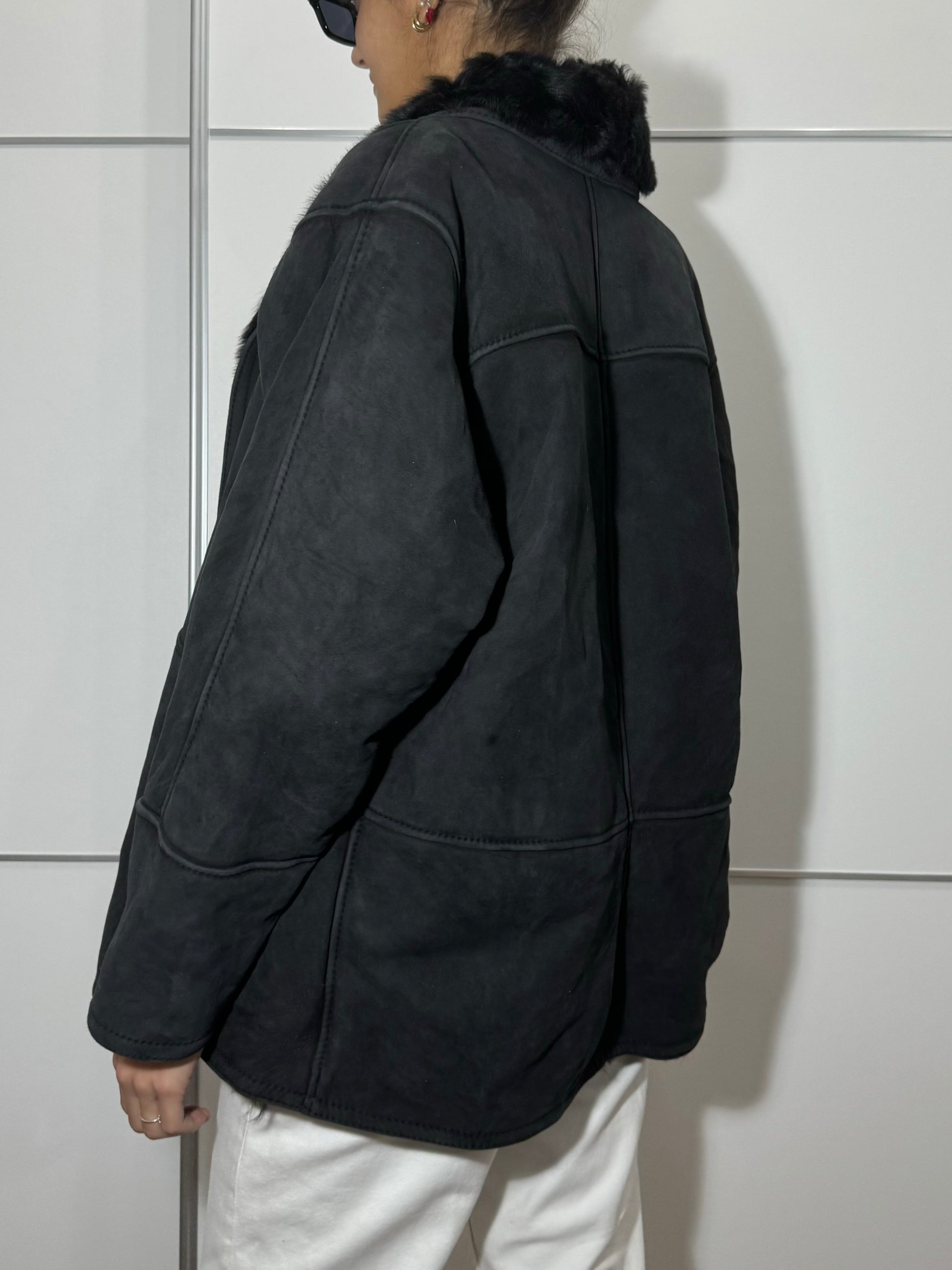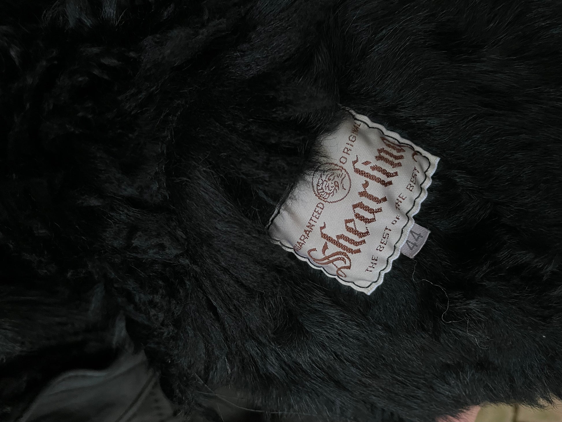 Montone originale Shearling nero scamosciato, interno a pelo lungo, rara taglia 44 da donna.