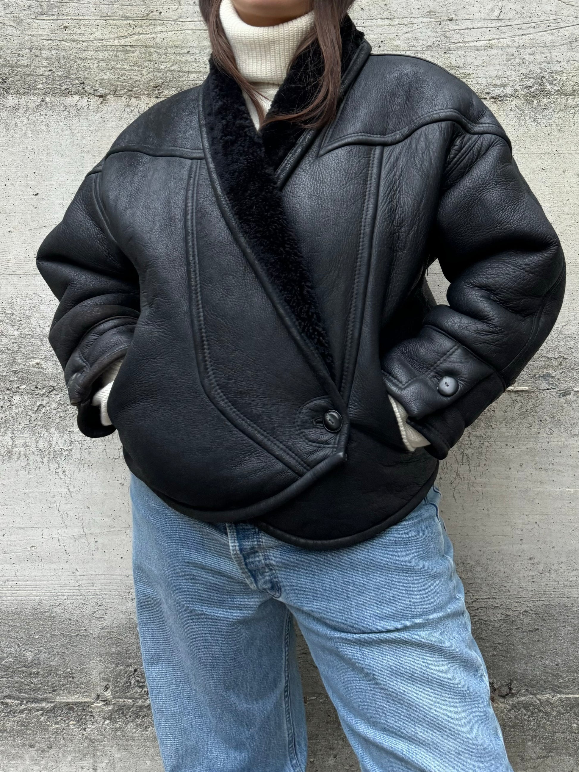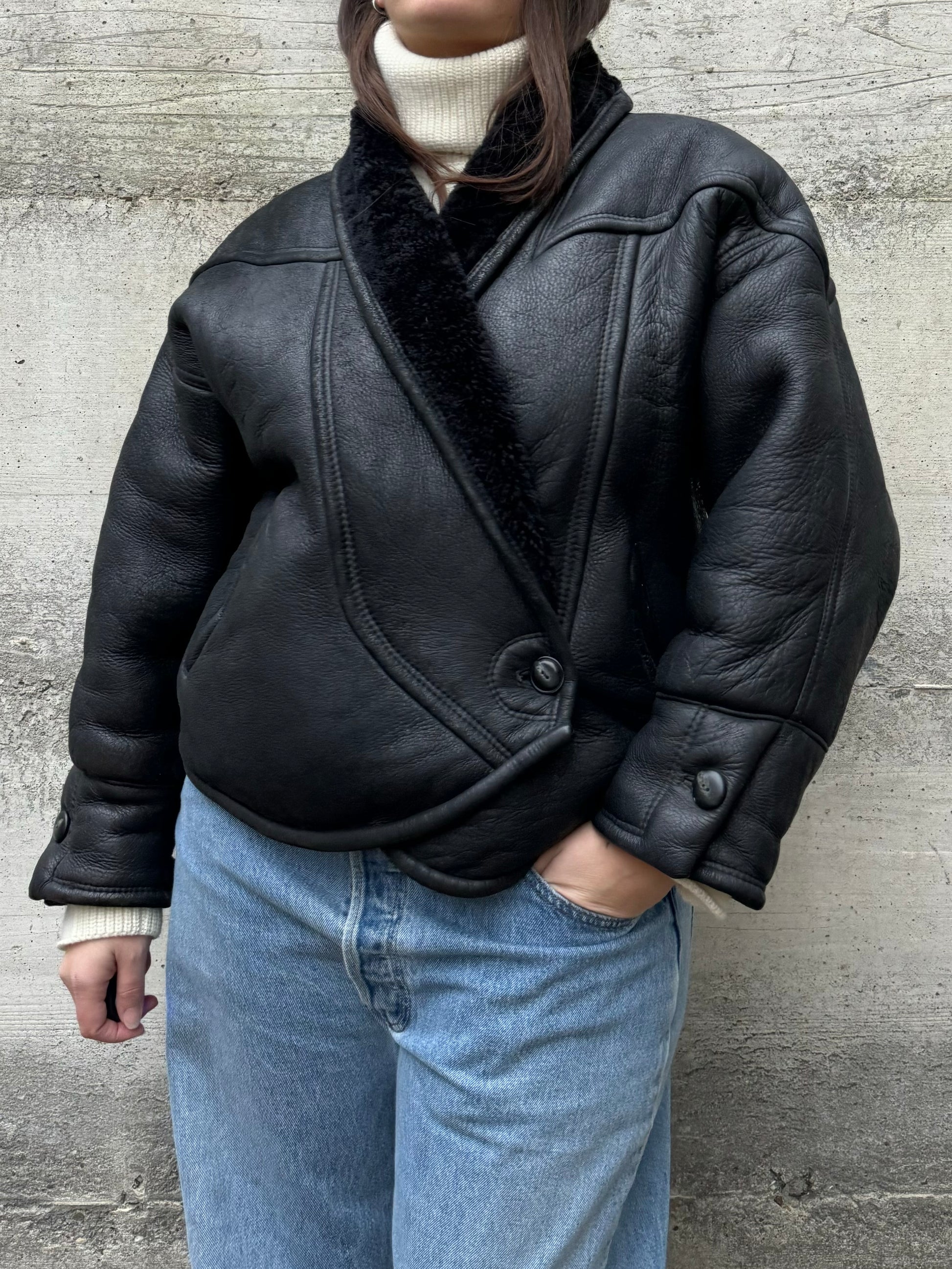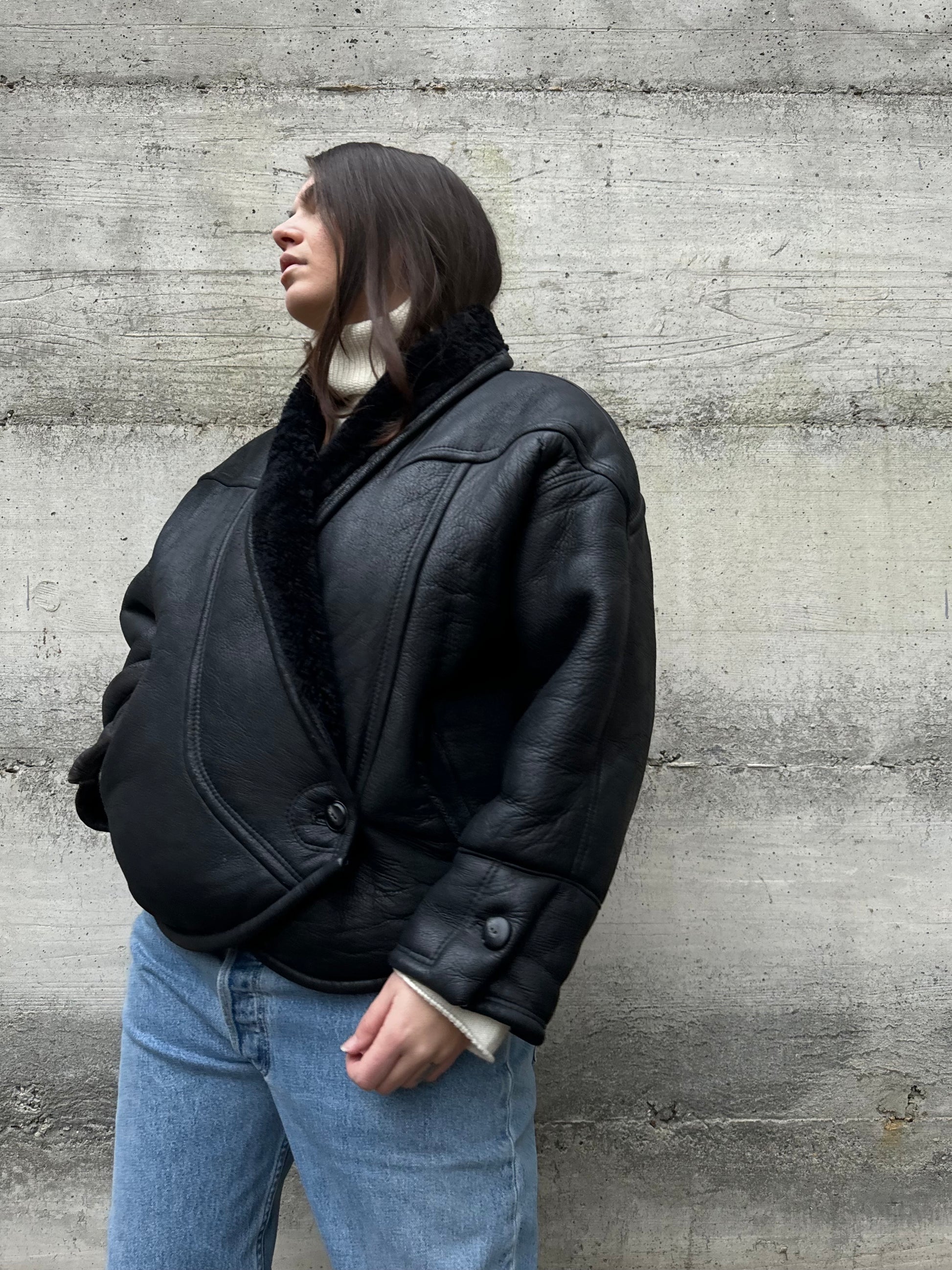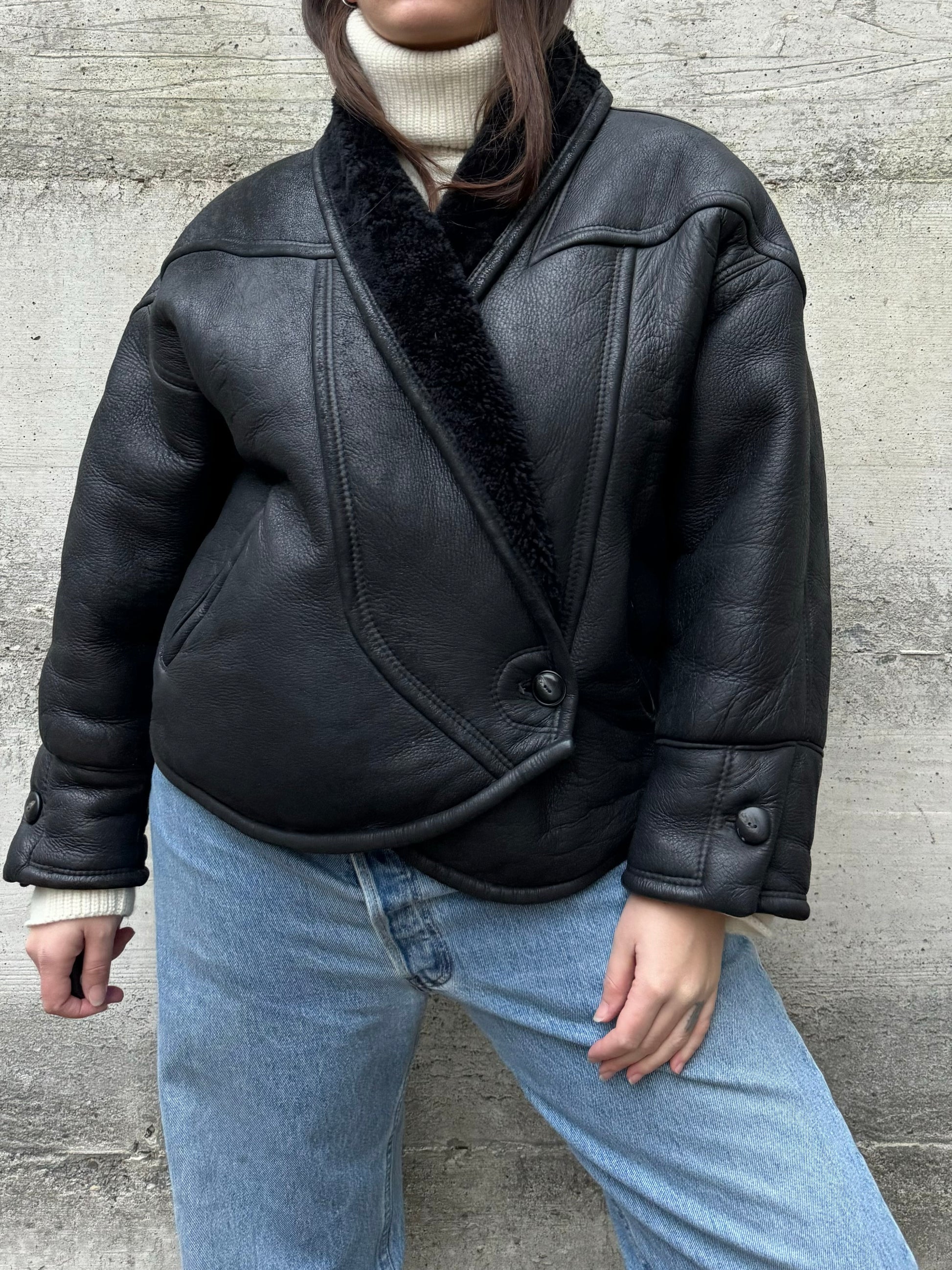 Montone originale Shearling cropped da donna, modello anni 80 a uovo, chiusura doppiopetto a portafoglio con bottone, dettaglio ripreso anche sui polsini.