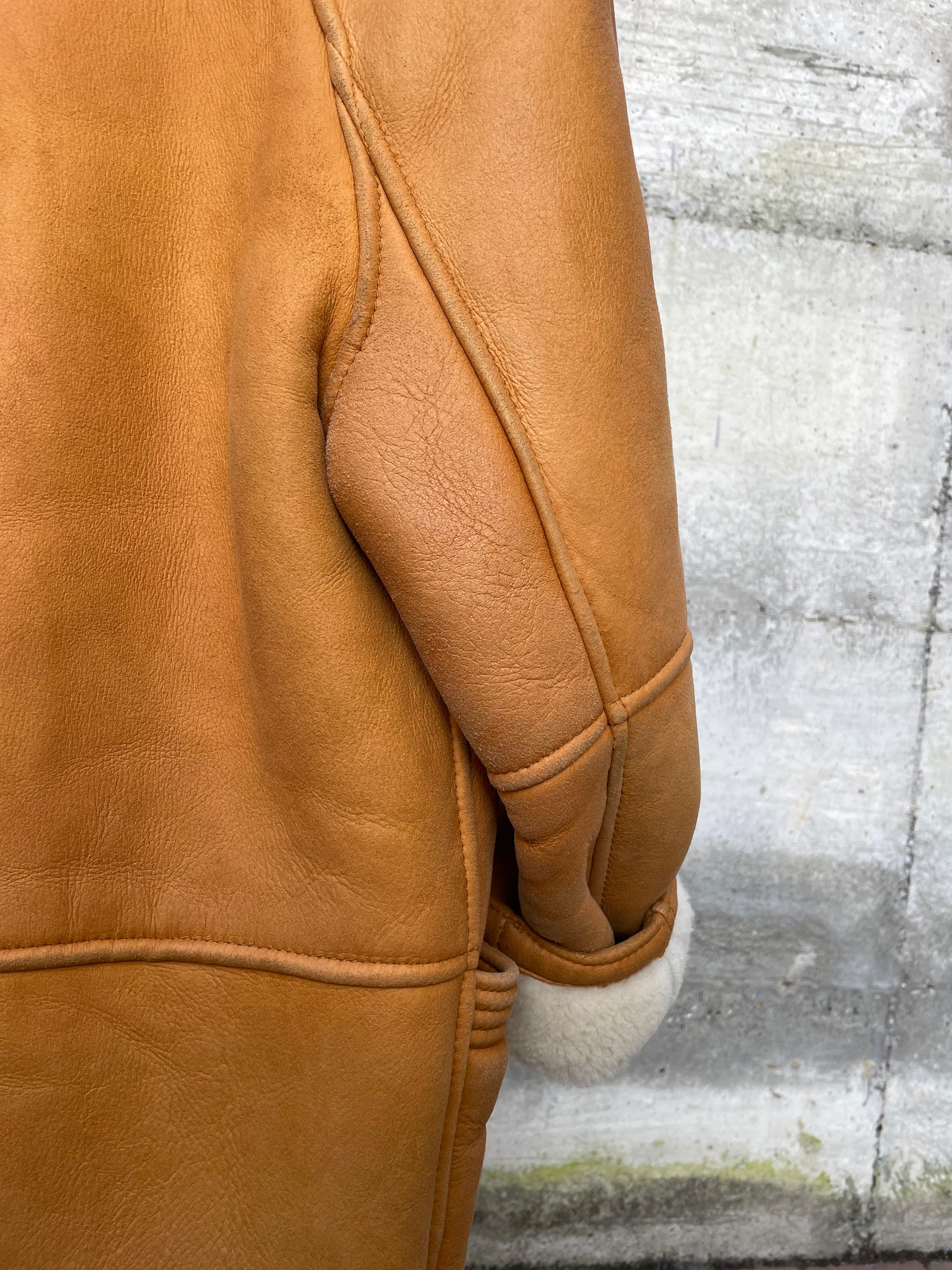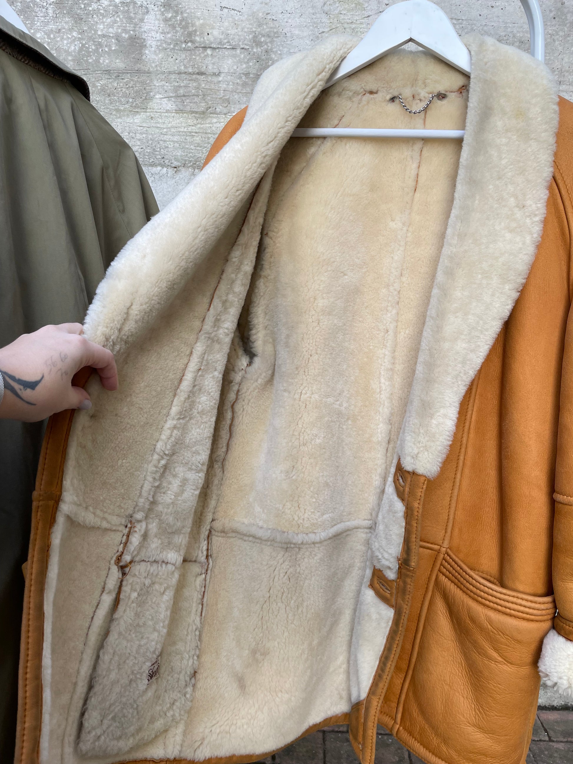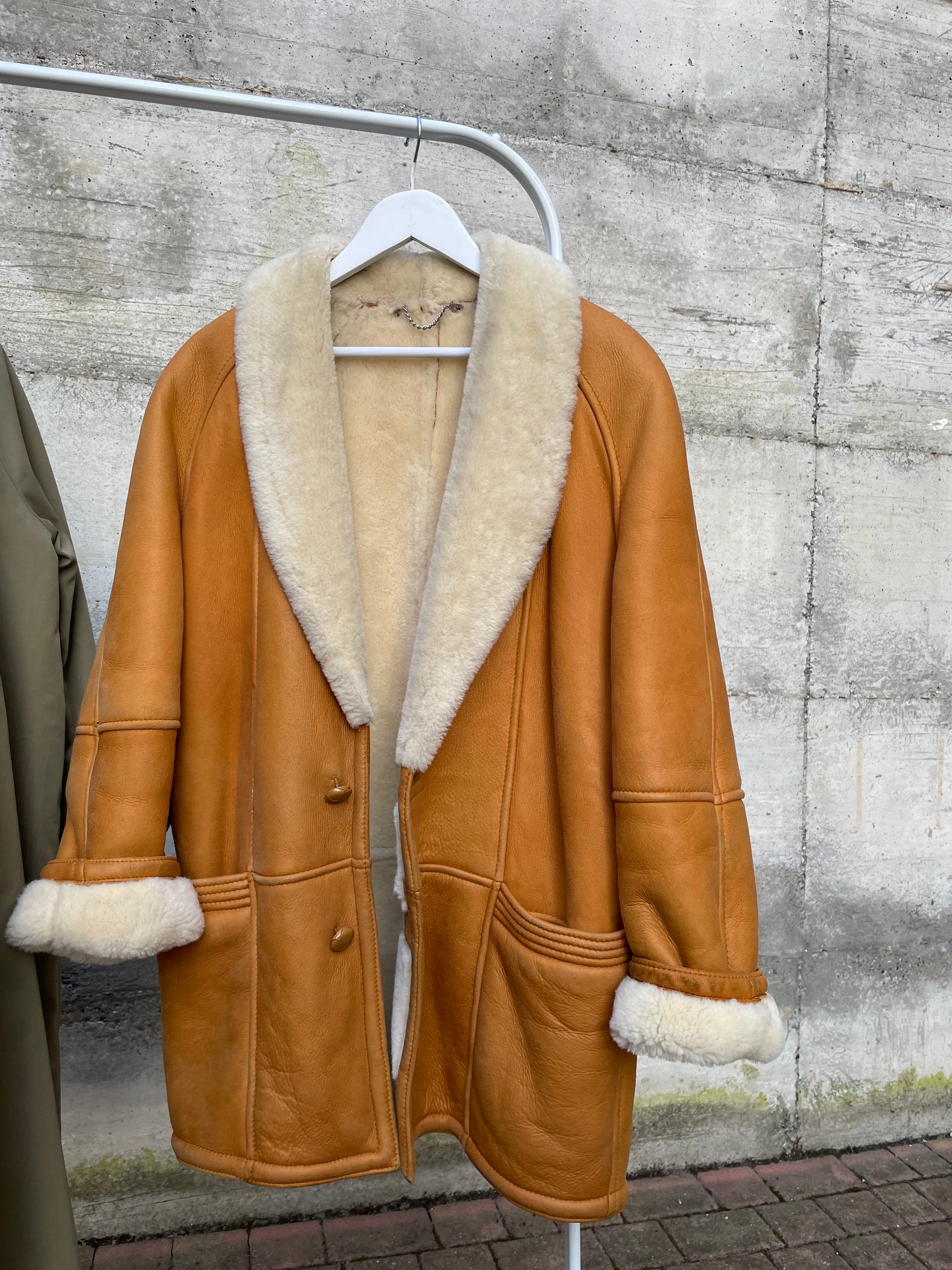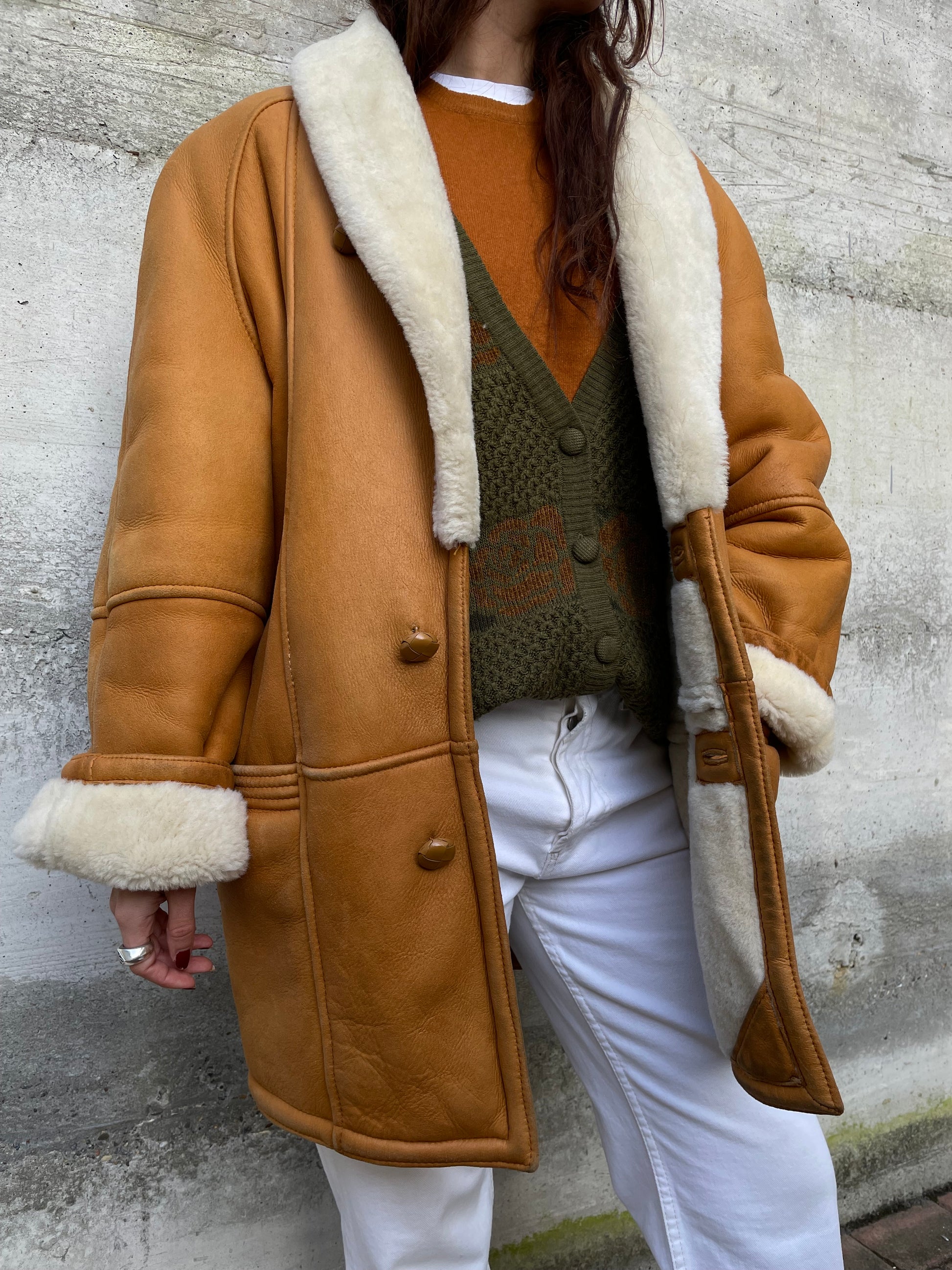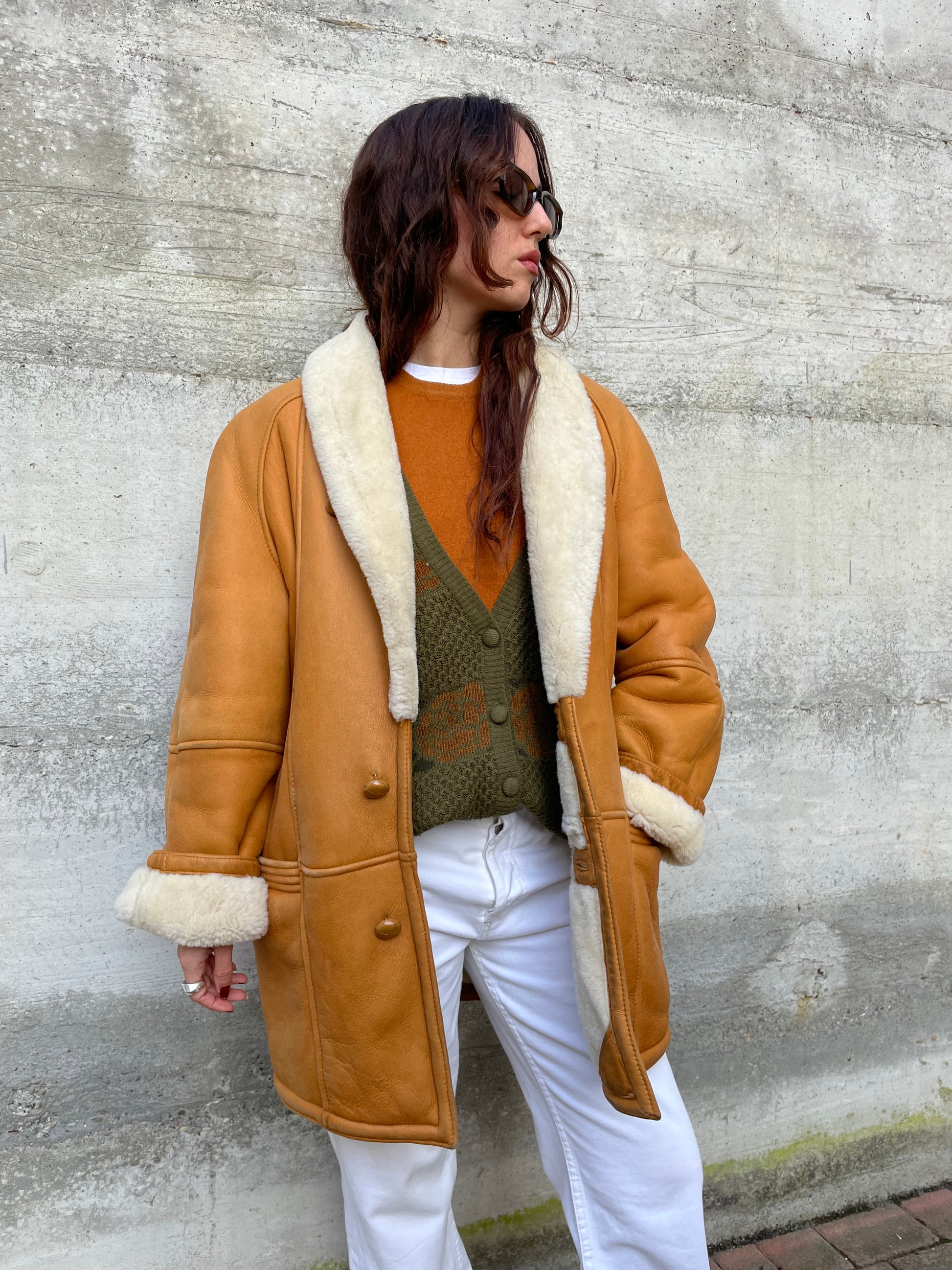 Montone Shearling originale a pelo bianco con esterno in pelle ruggine.