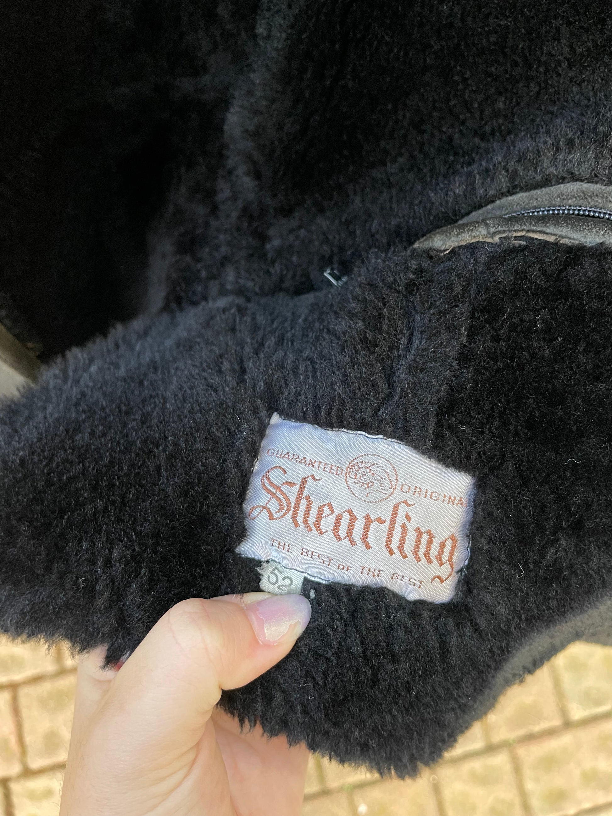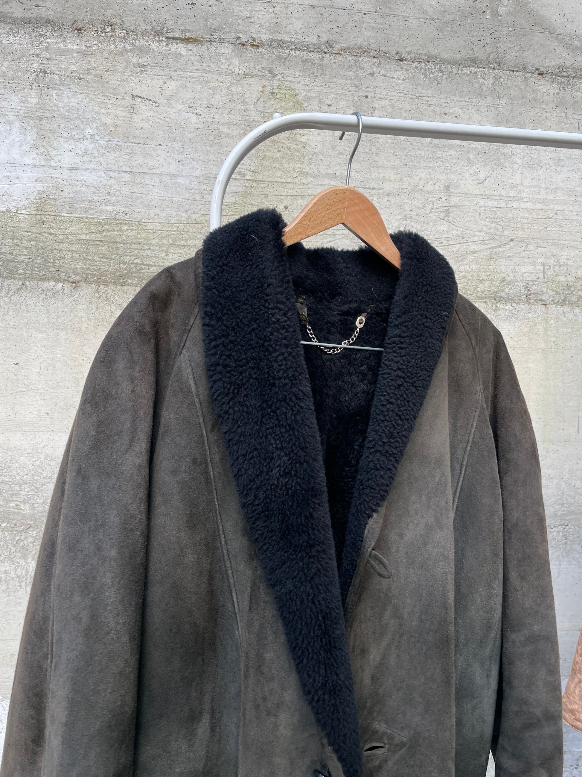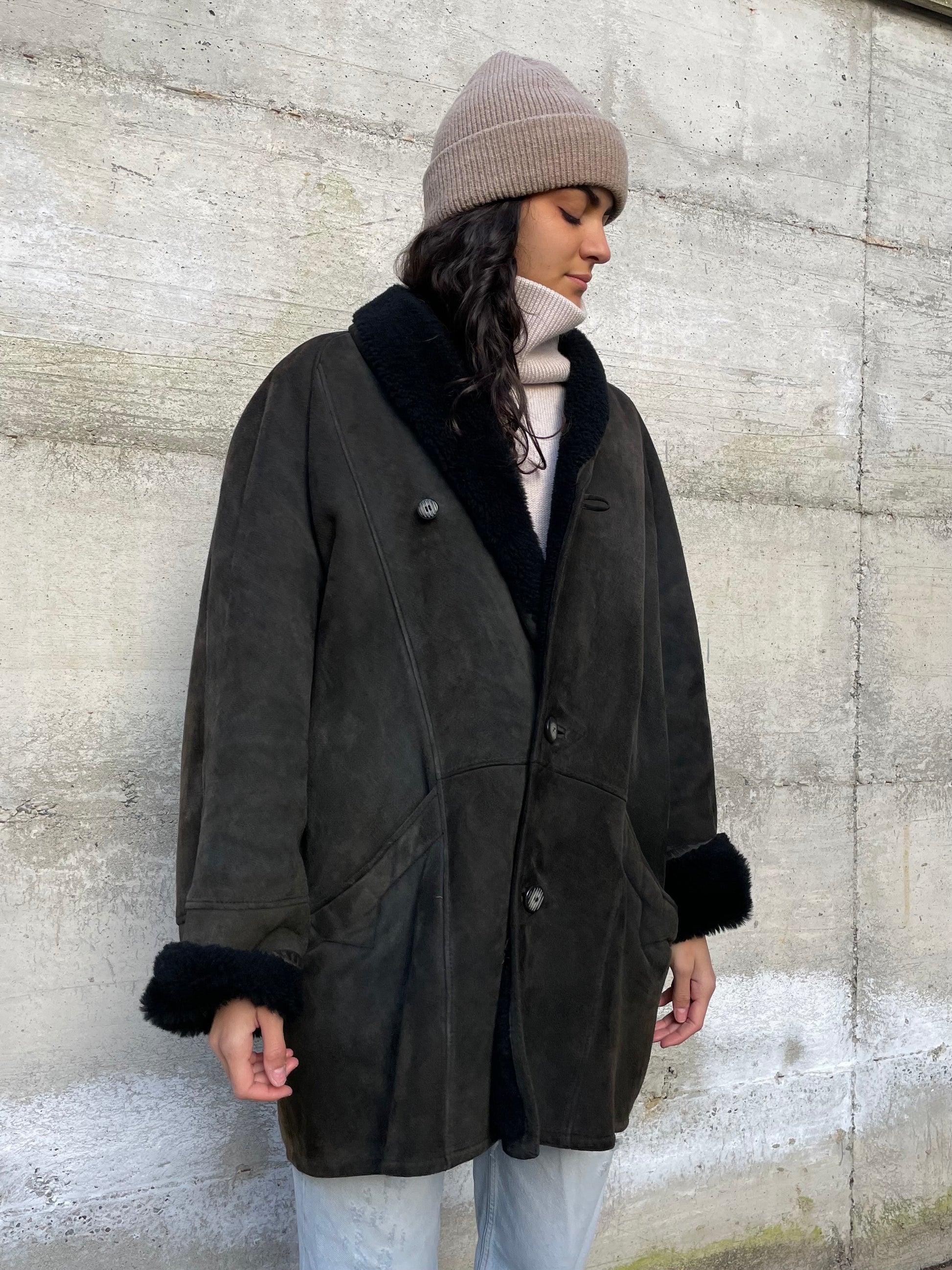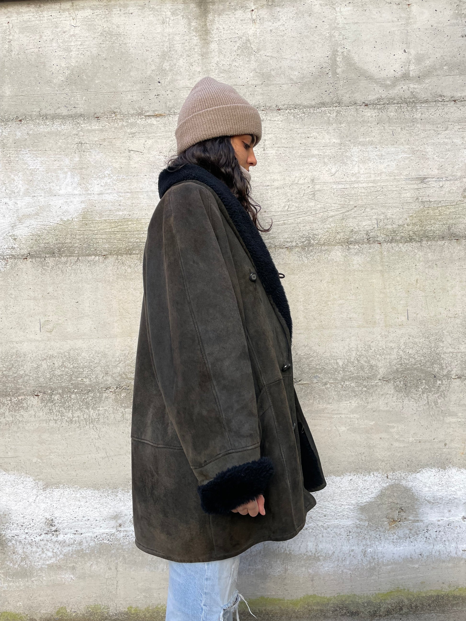 Montone Shearling scamosciato nero tendente al verde, pelo raso nero, taglia 52it uomo
