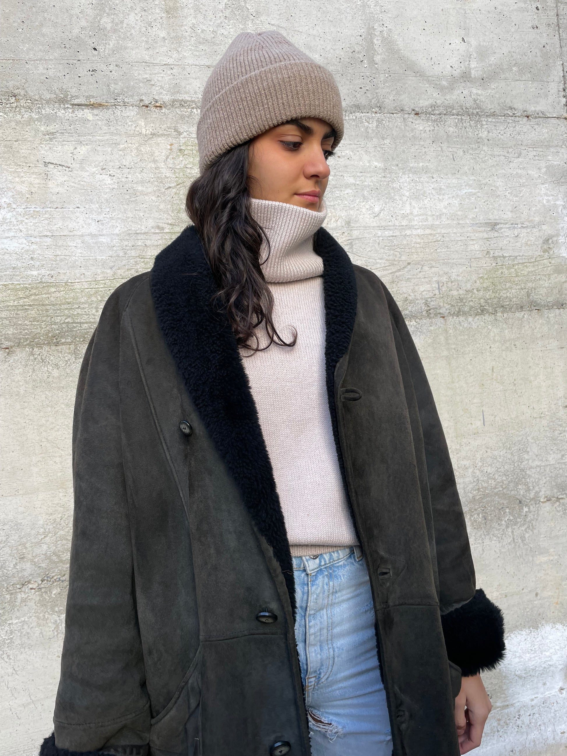 Montone Shearling scamosciato nero tendente al verde, pelo raso nero.