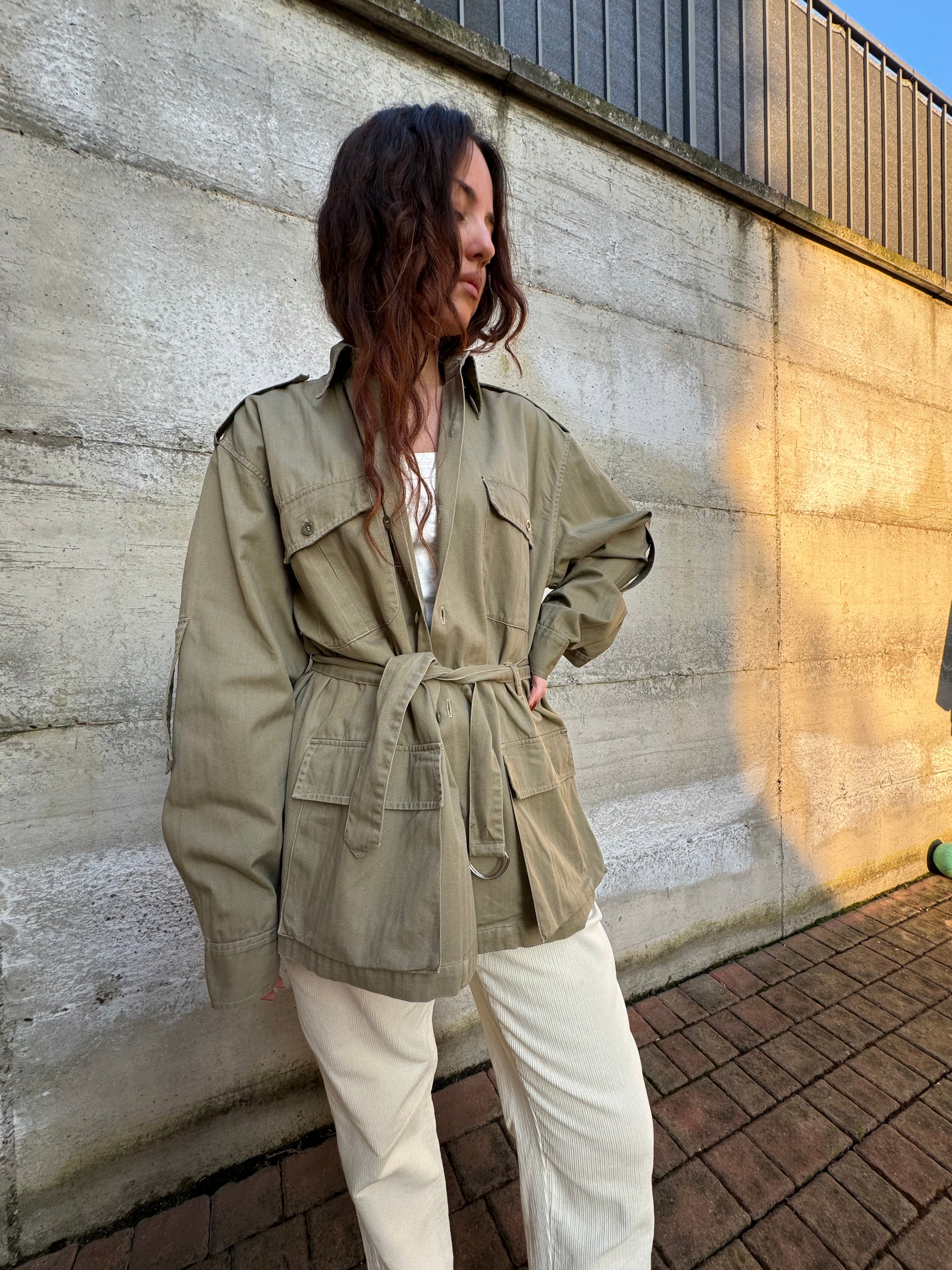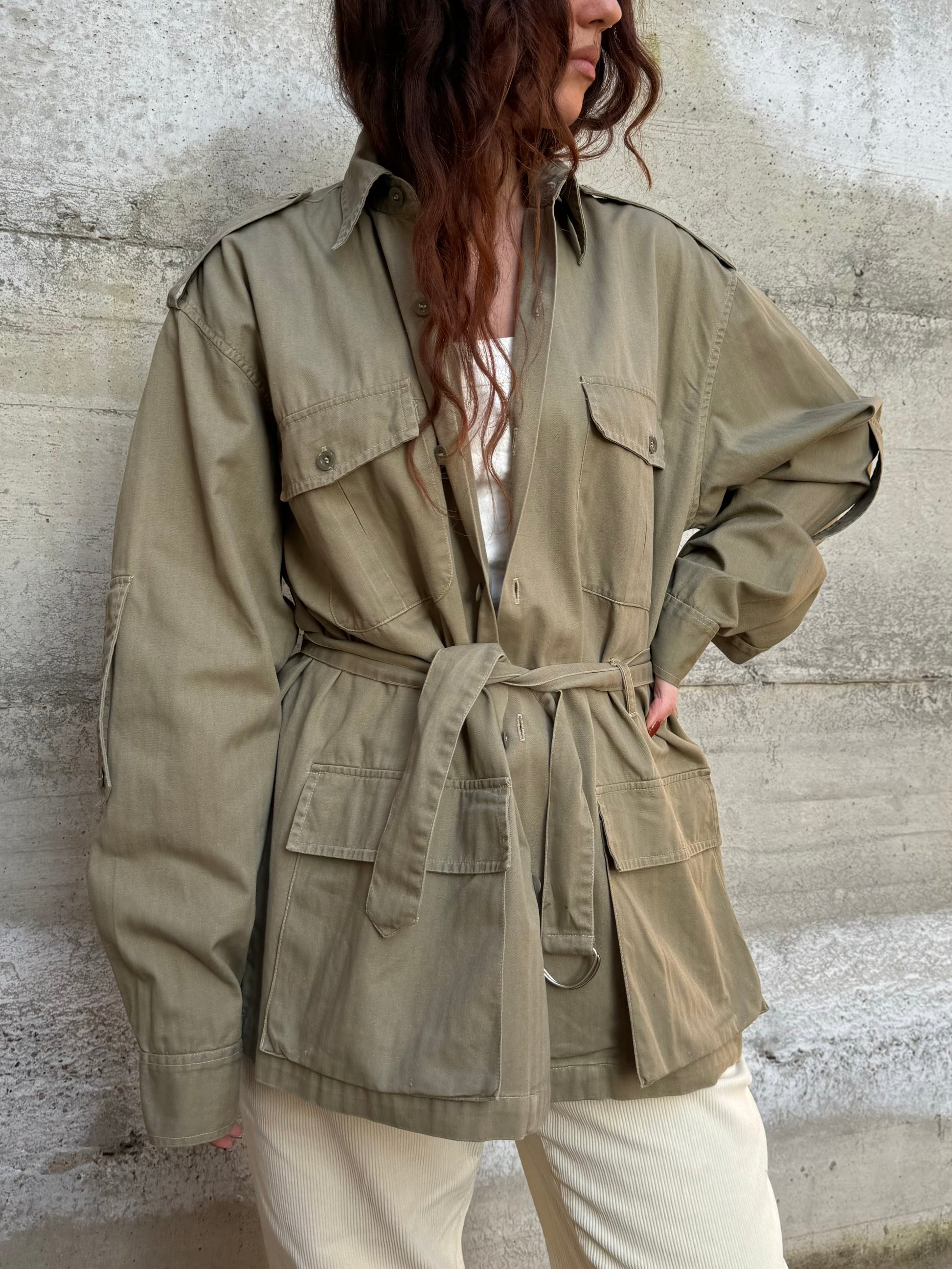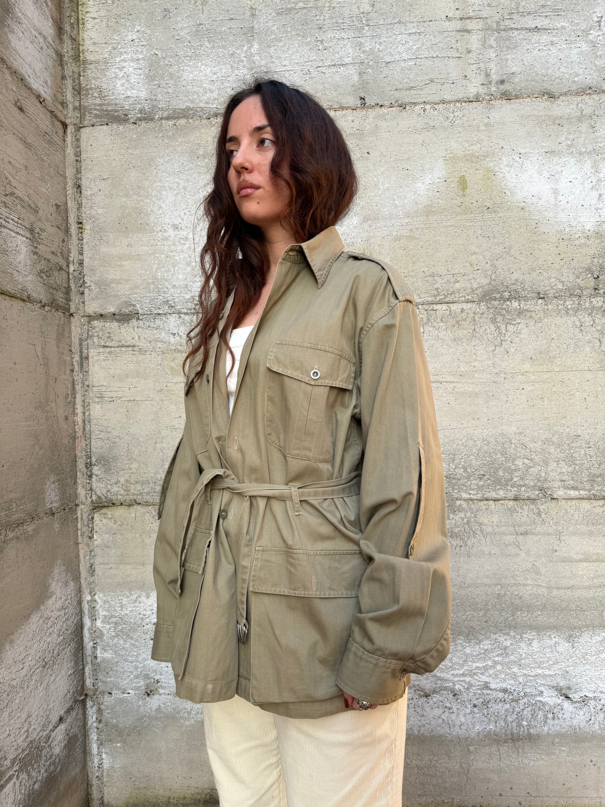 Sahariana multitasche con cintura color cachi, 100% cotone.