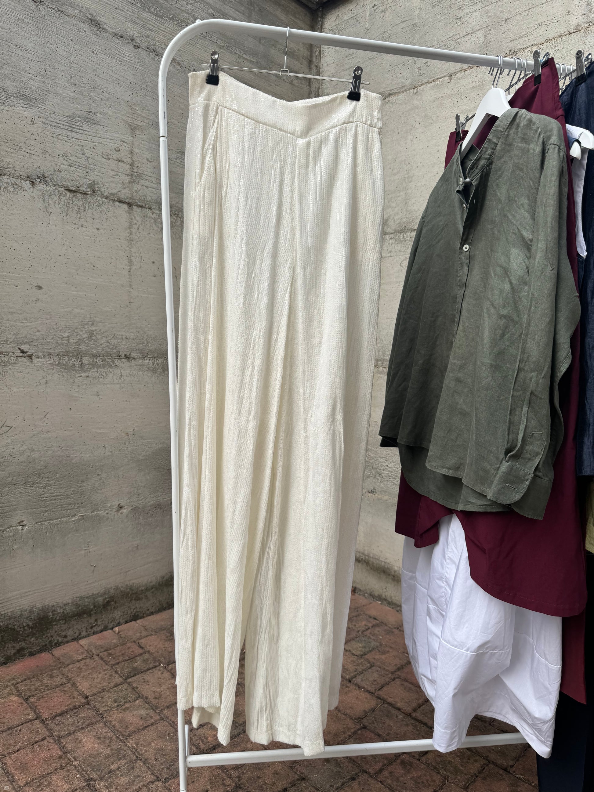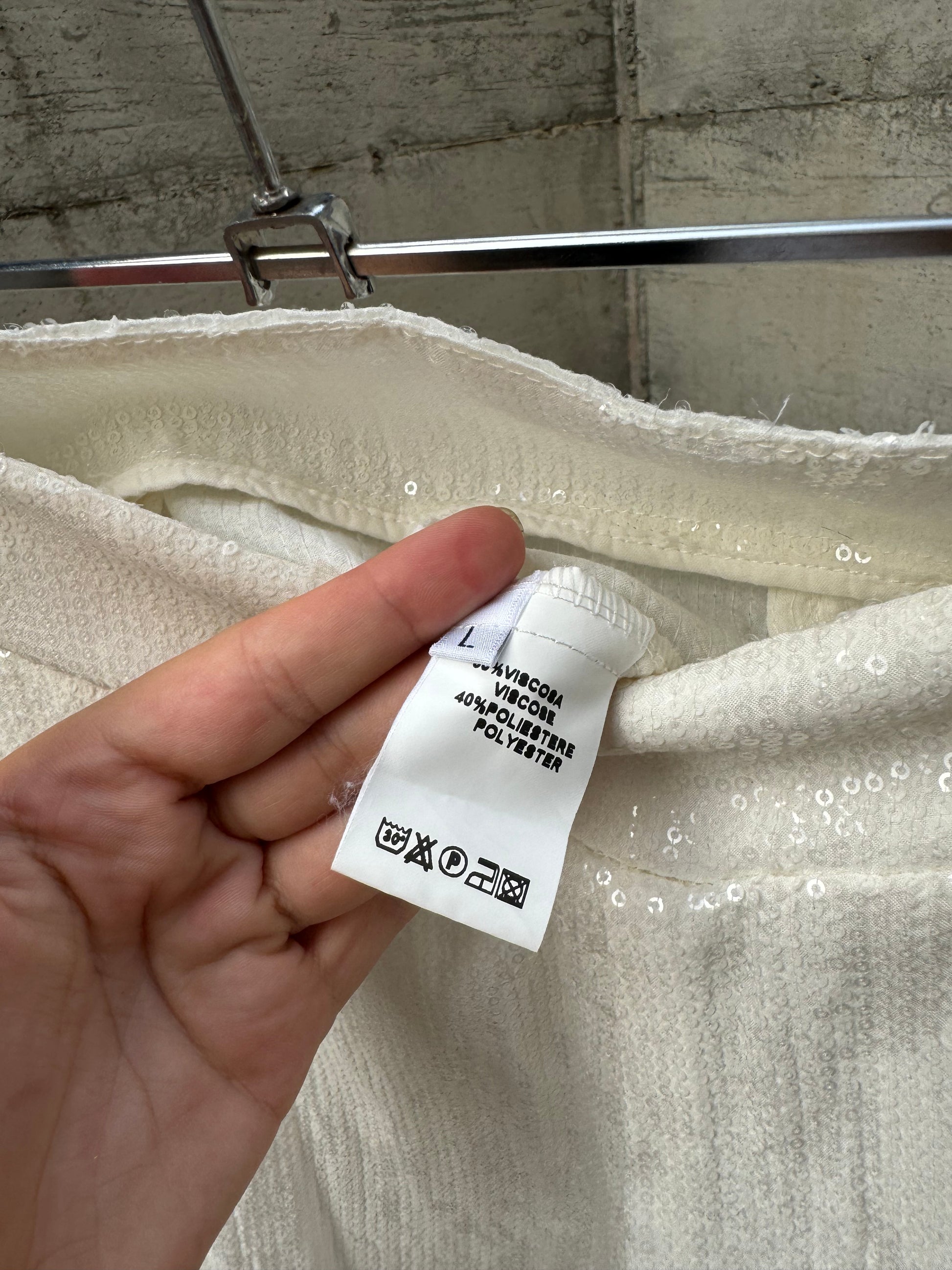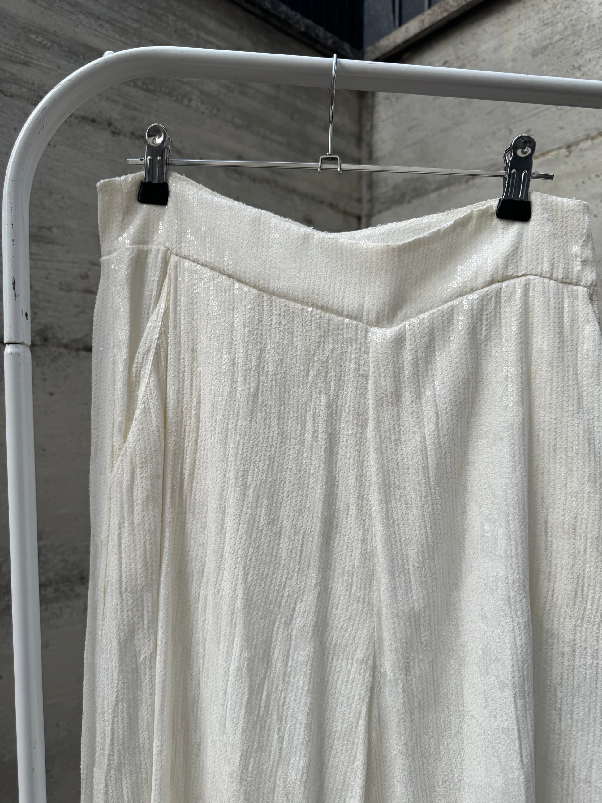 Splendido pantalone a palazzo a vita alta bianco, con pailettes trasparenti (quindi l’effetto è molto sobrio) e lavorazione a fiori che si nota in controluce.