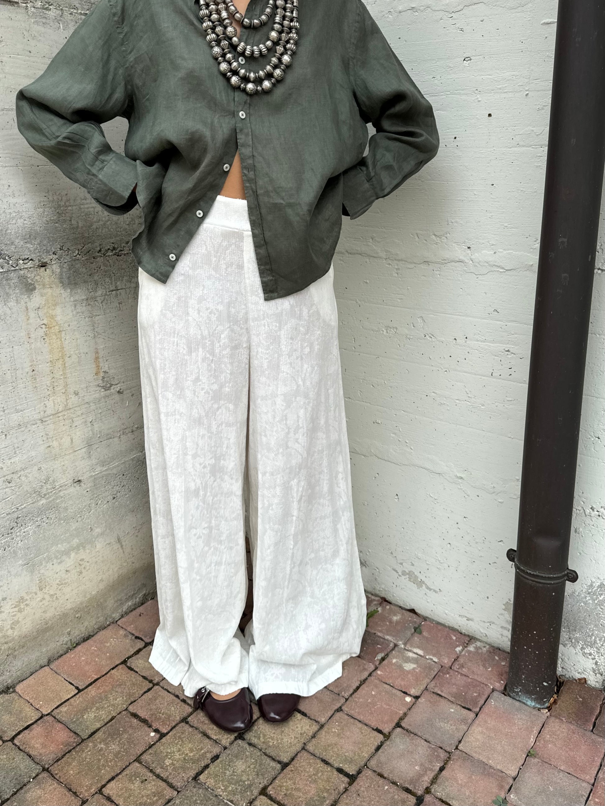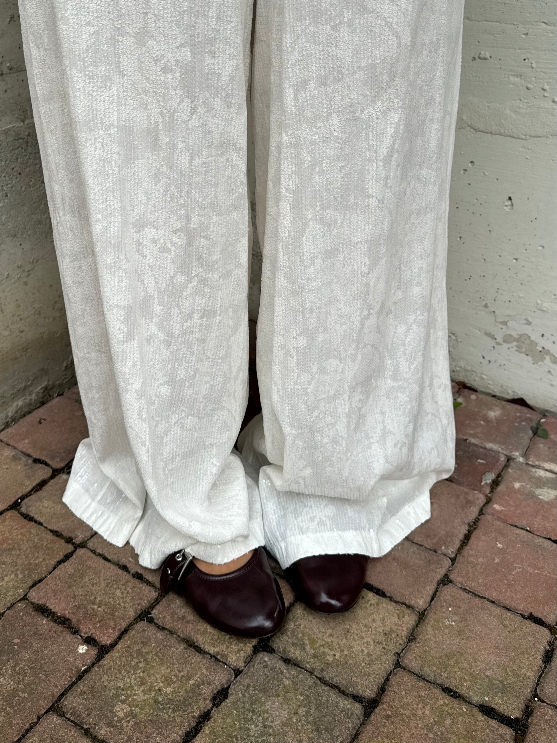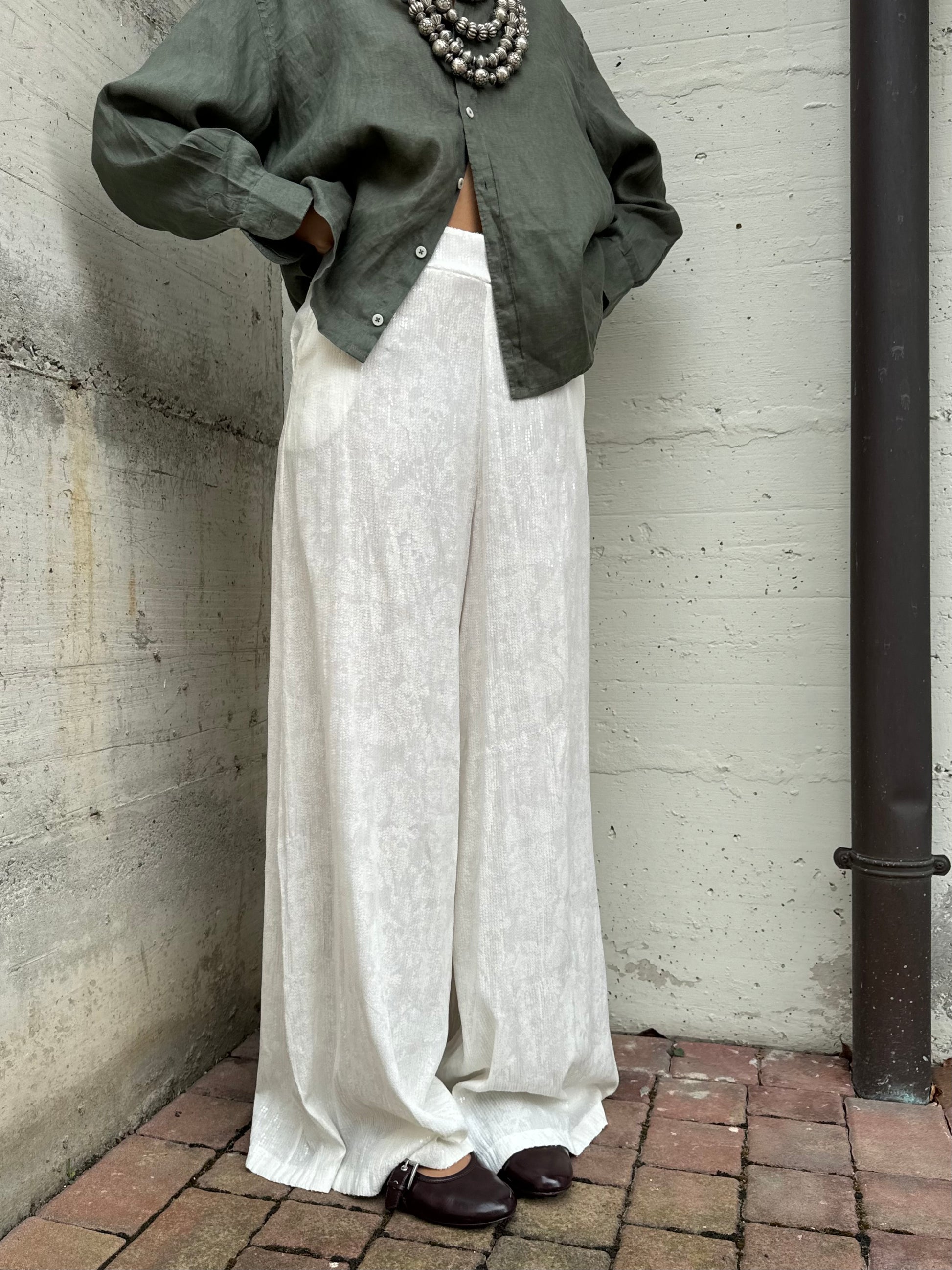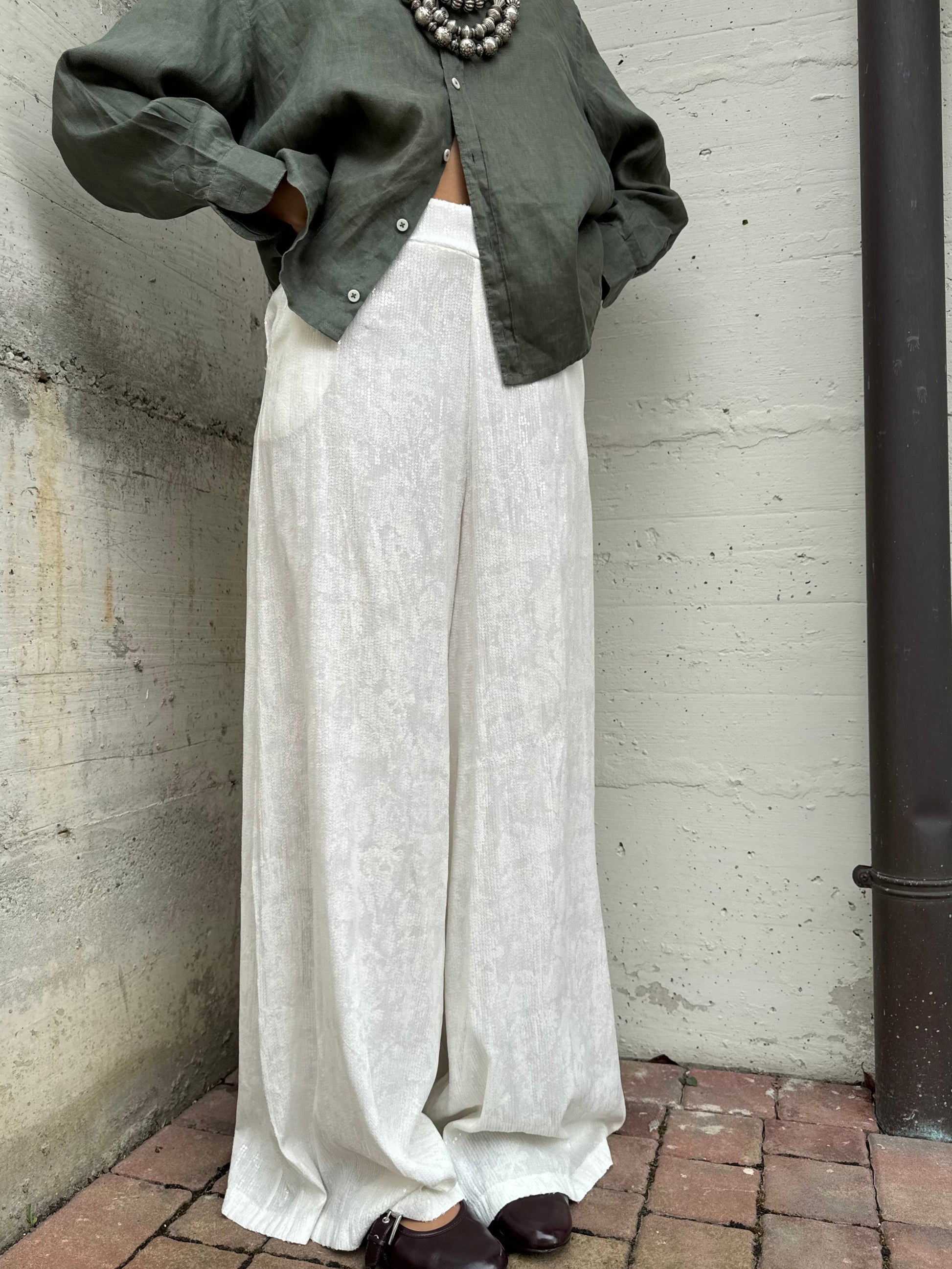 Splendido pantalone a palazzo a vita alta bianco, con pailettes trasparenti (quindi l’effetto è molto sobrio) e lavorazione a fiori che si nota in controluce.
