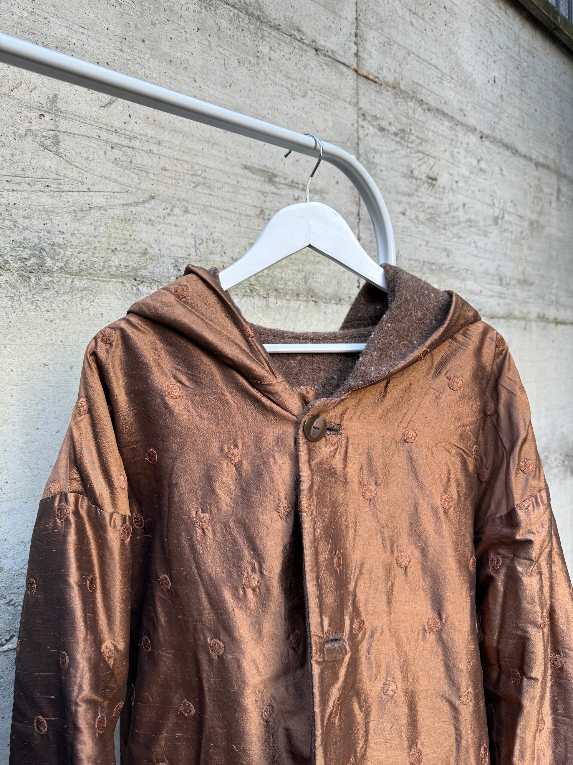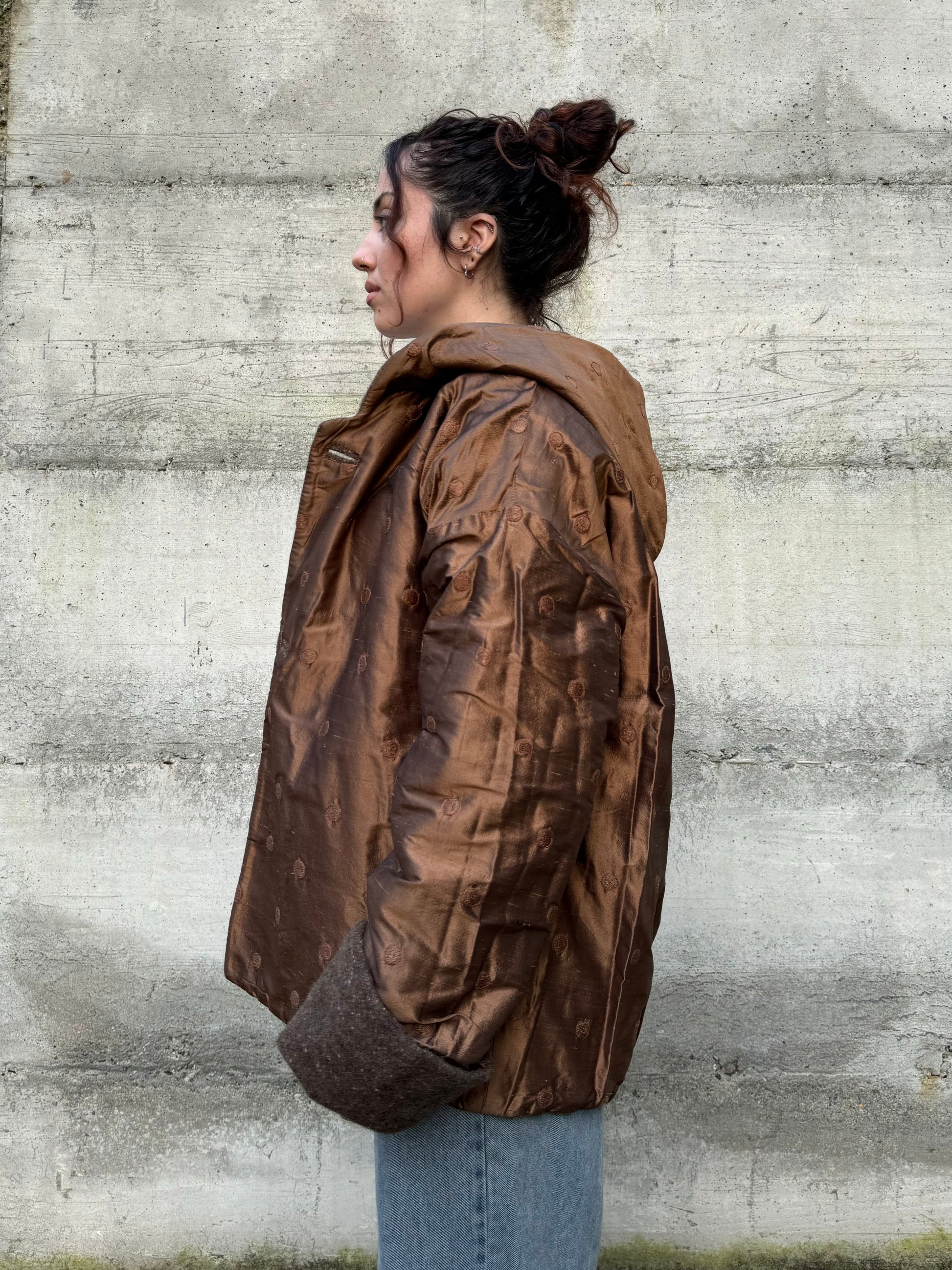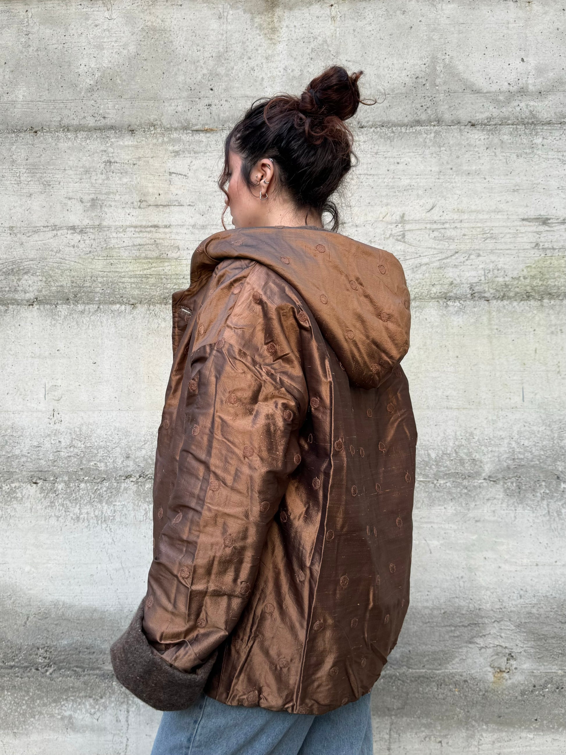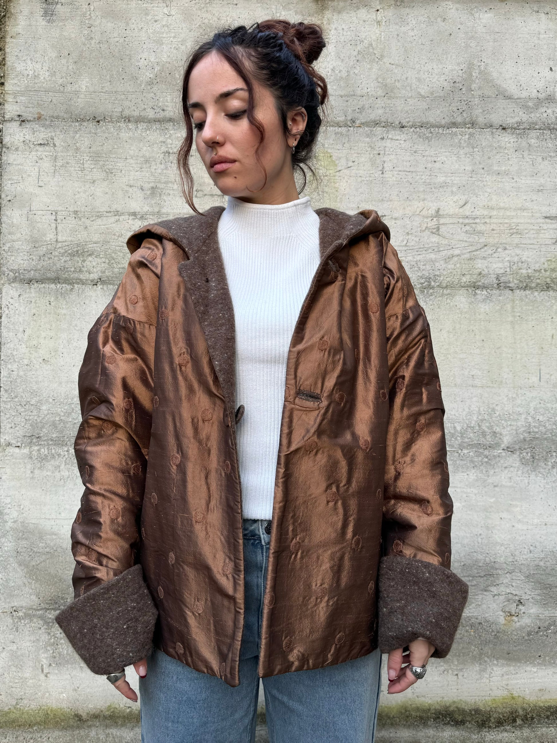 Piumino doubleface con cappuccio, shantung di seta e misto lana/mohair