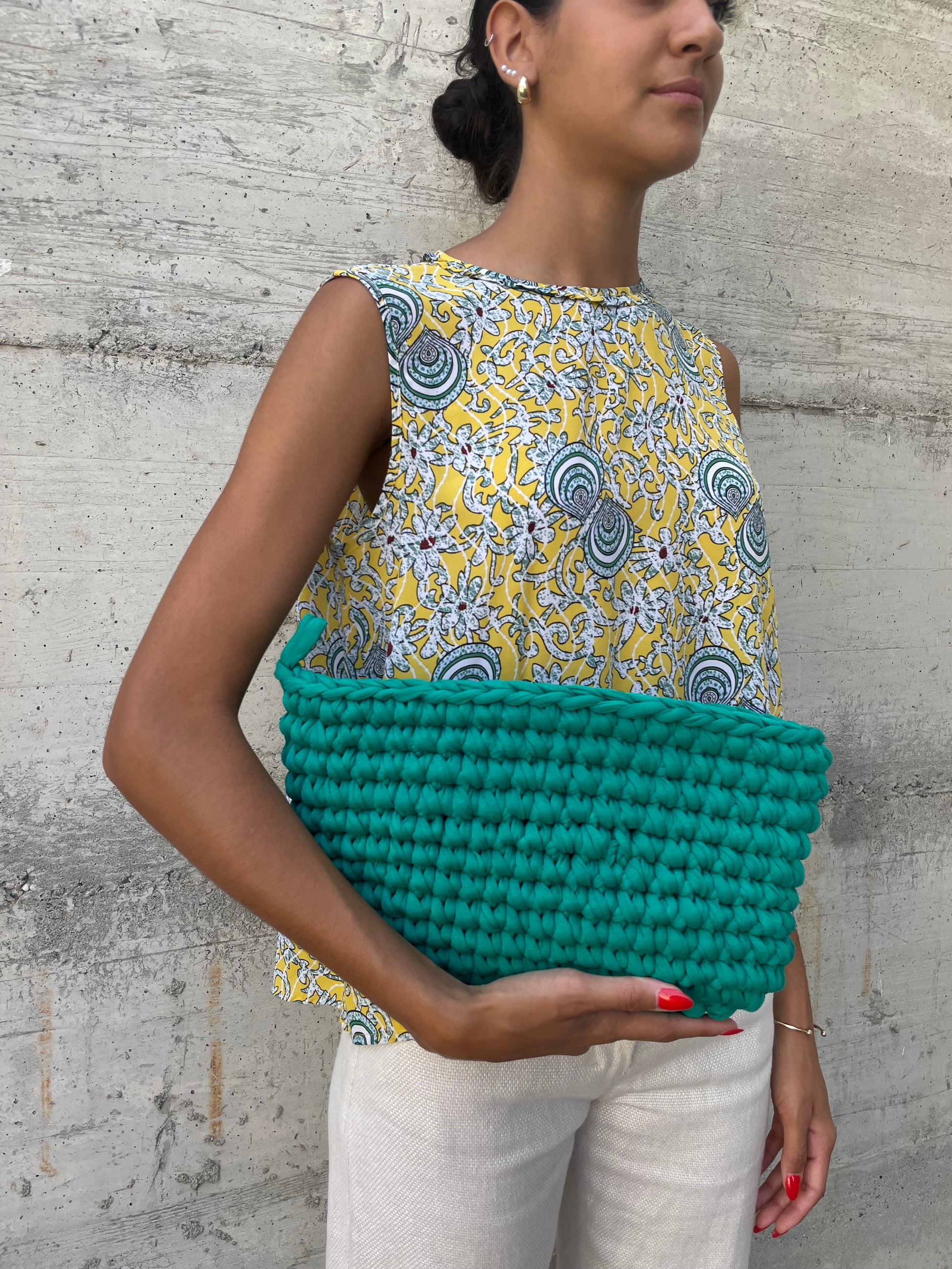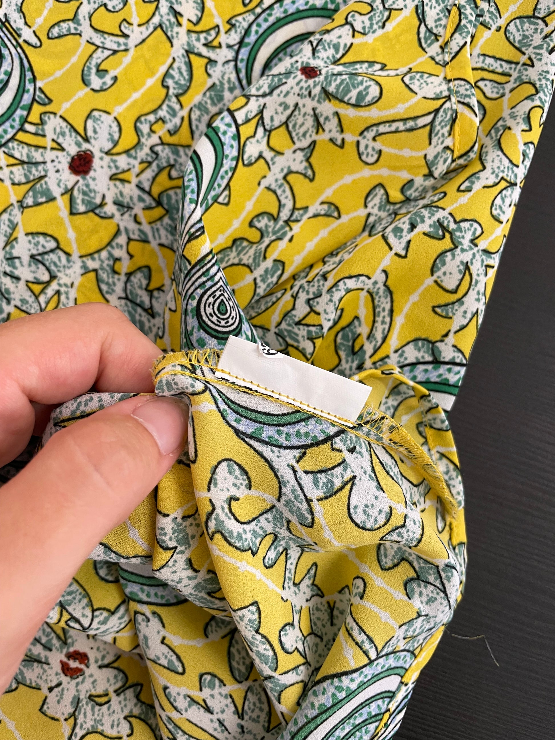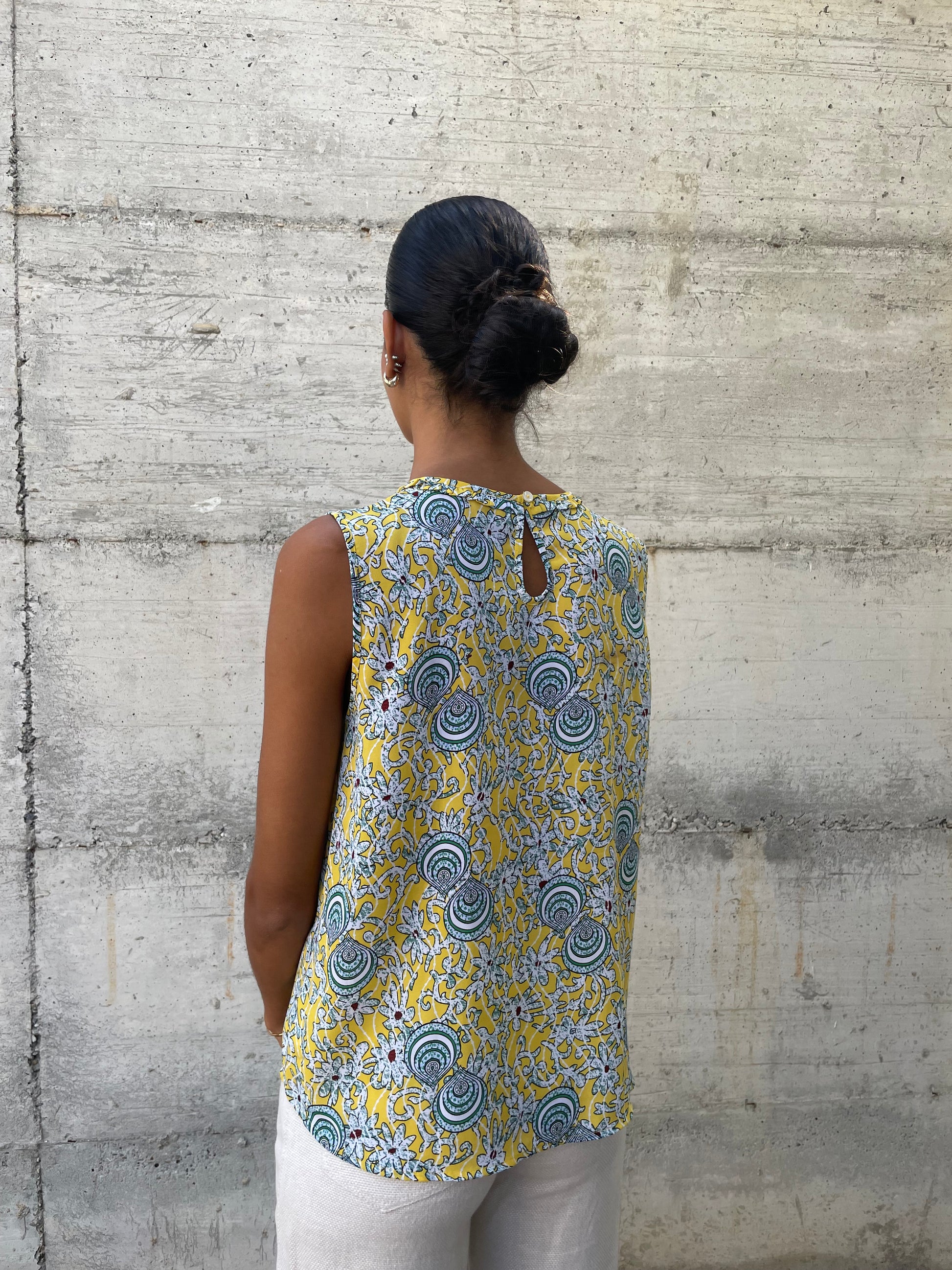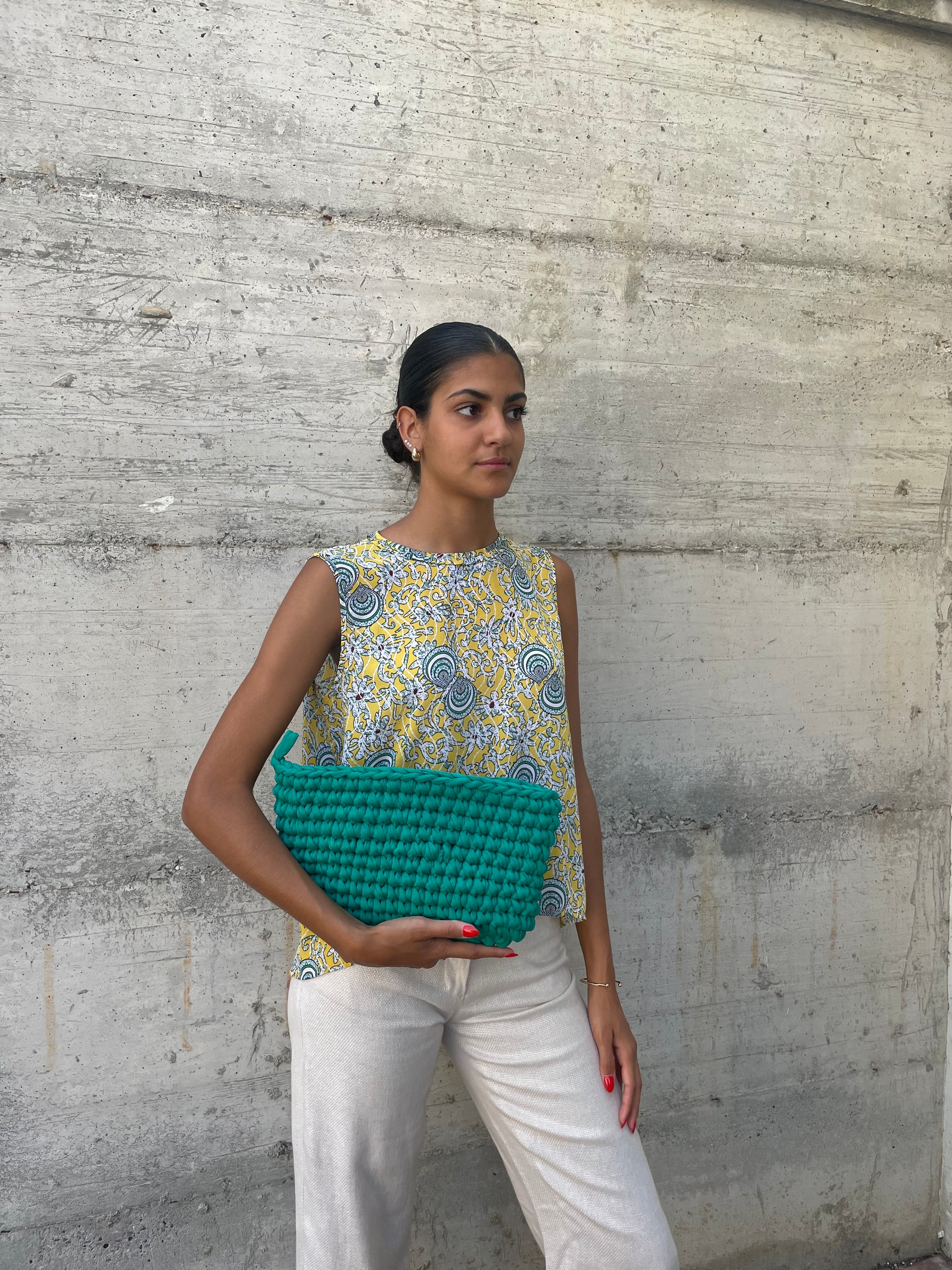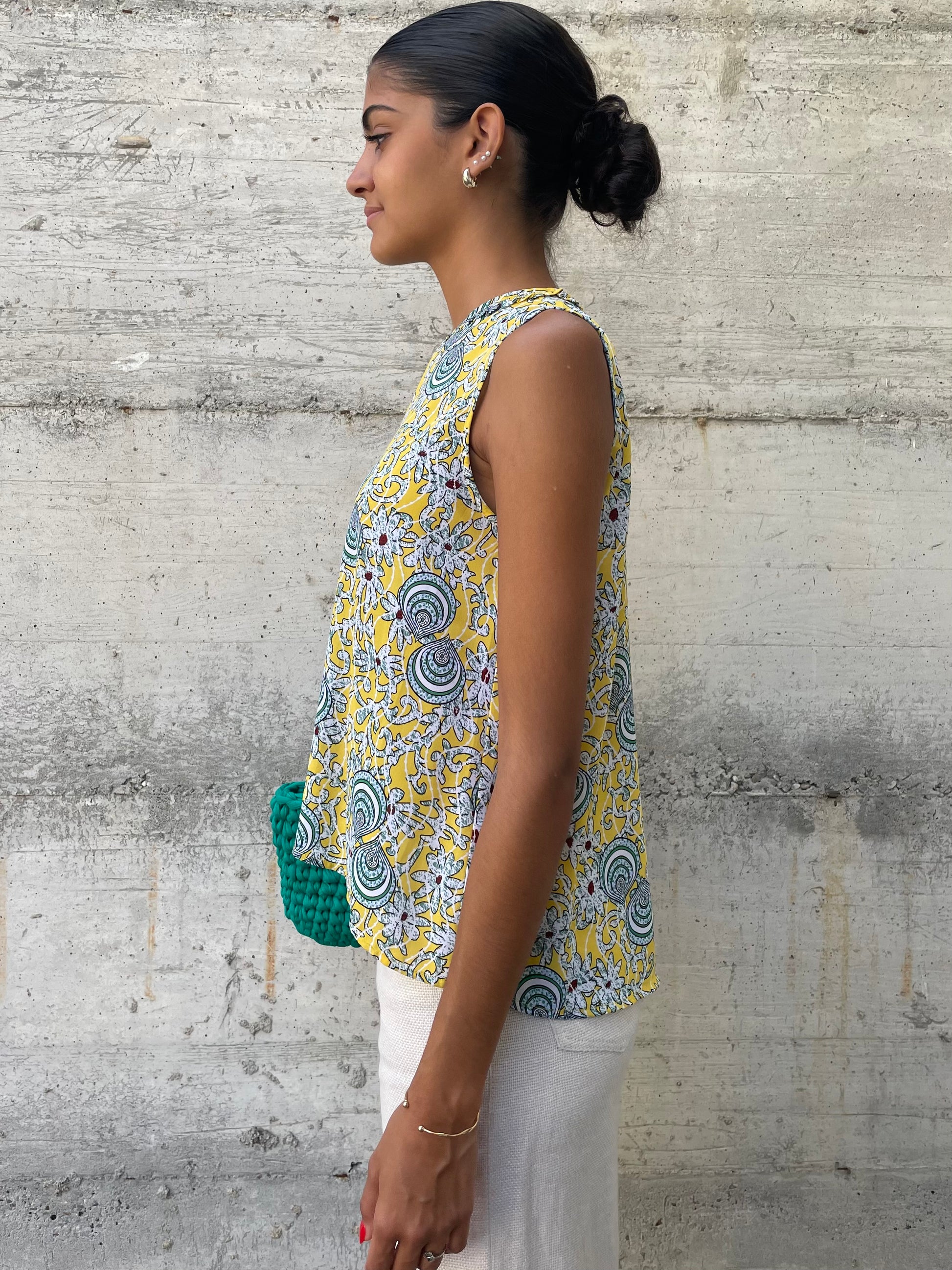 Top Benetton anni 90 in viscosa, pattern giallo e verde petrolio.