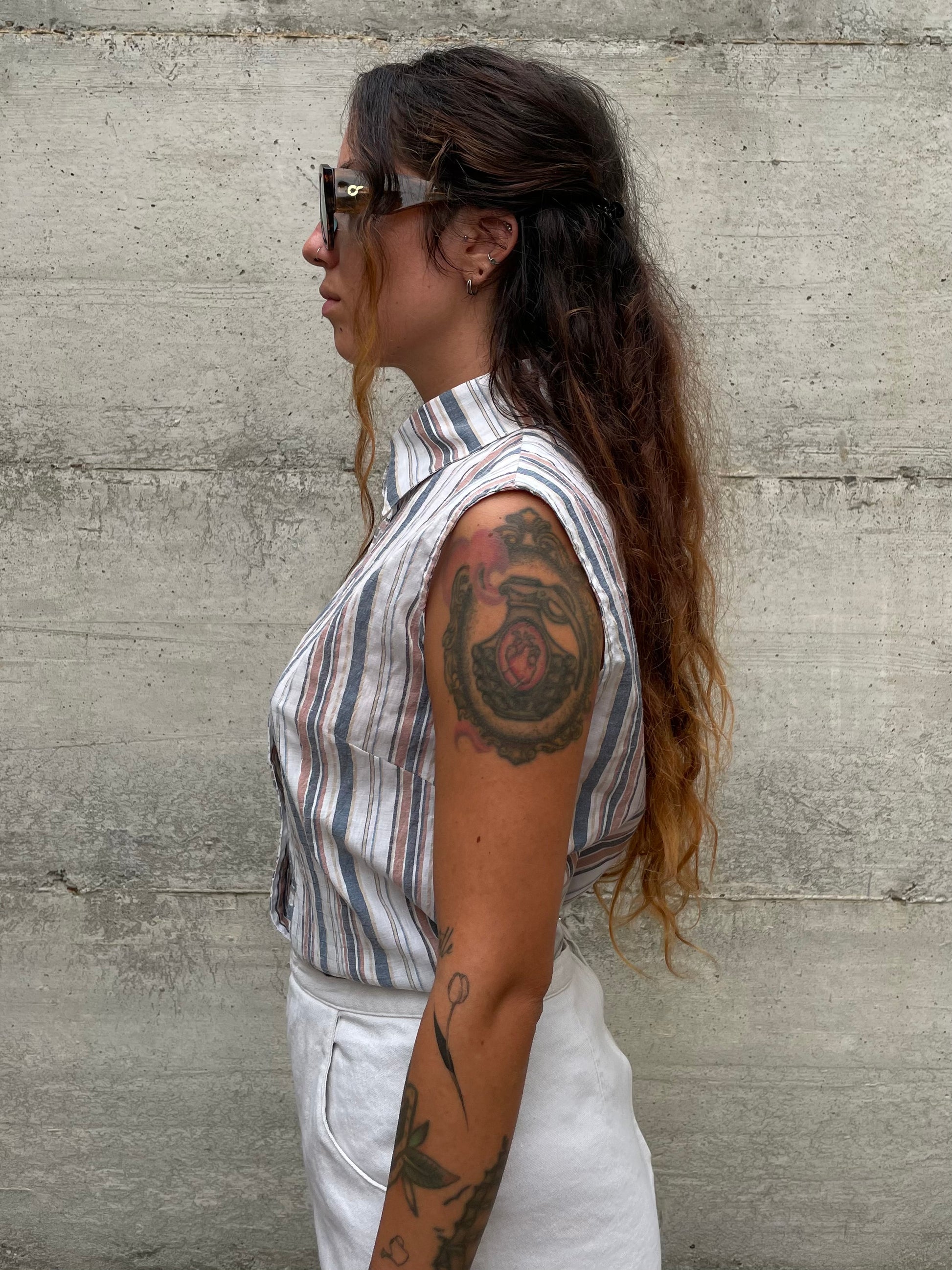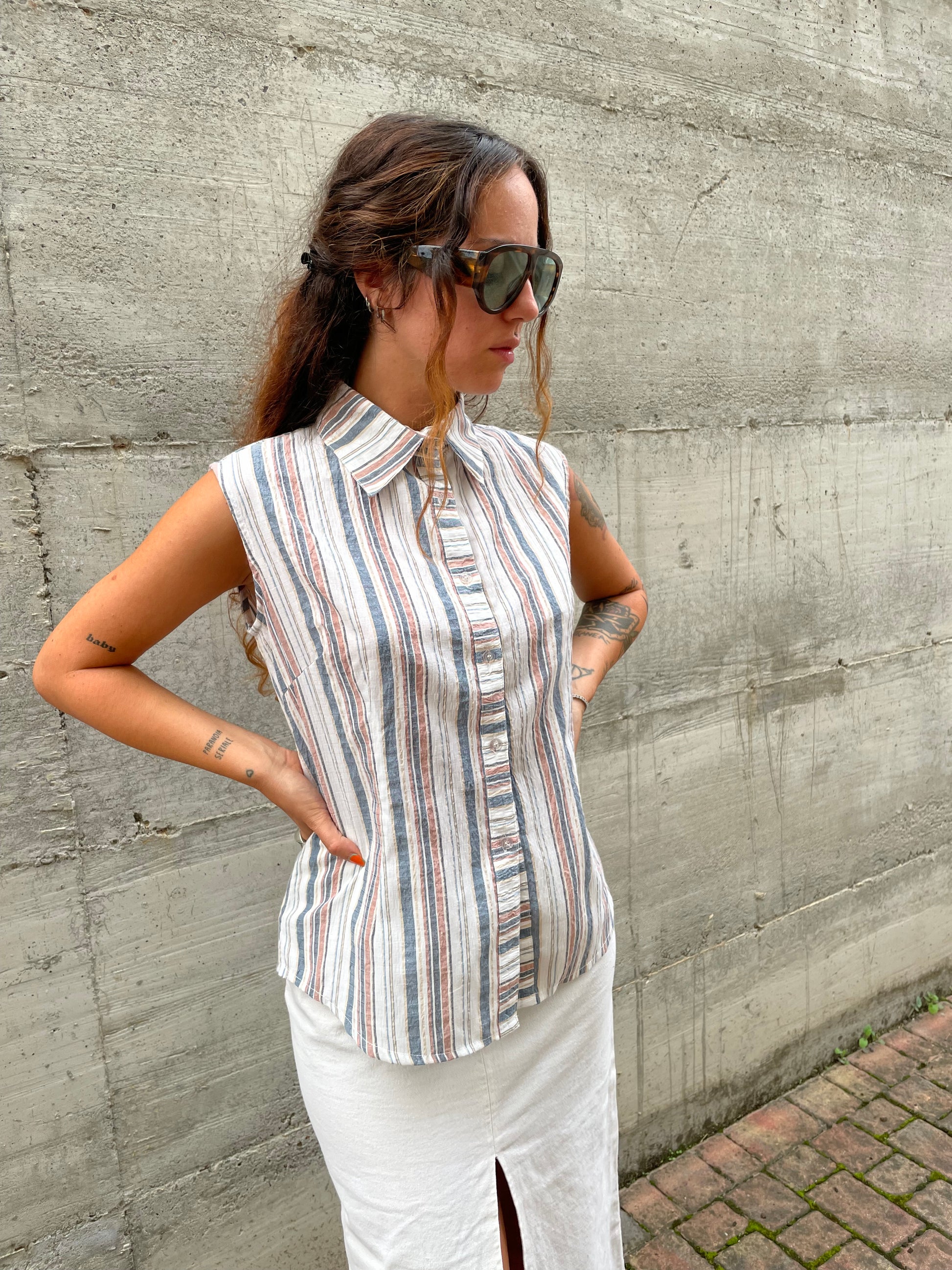 Top polo smanicato, a righe verticali irregolari multicolor.