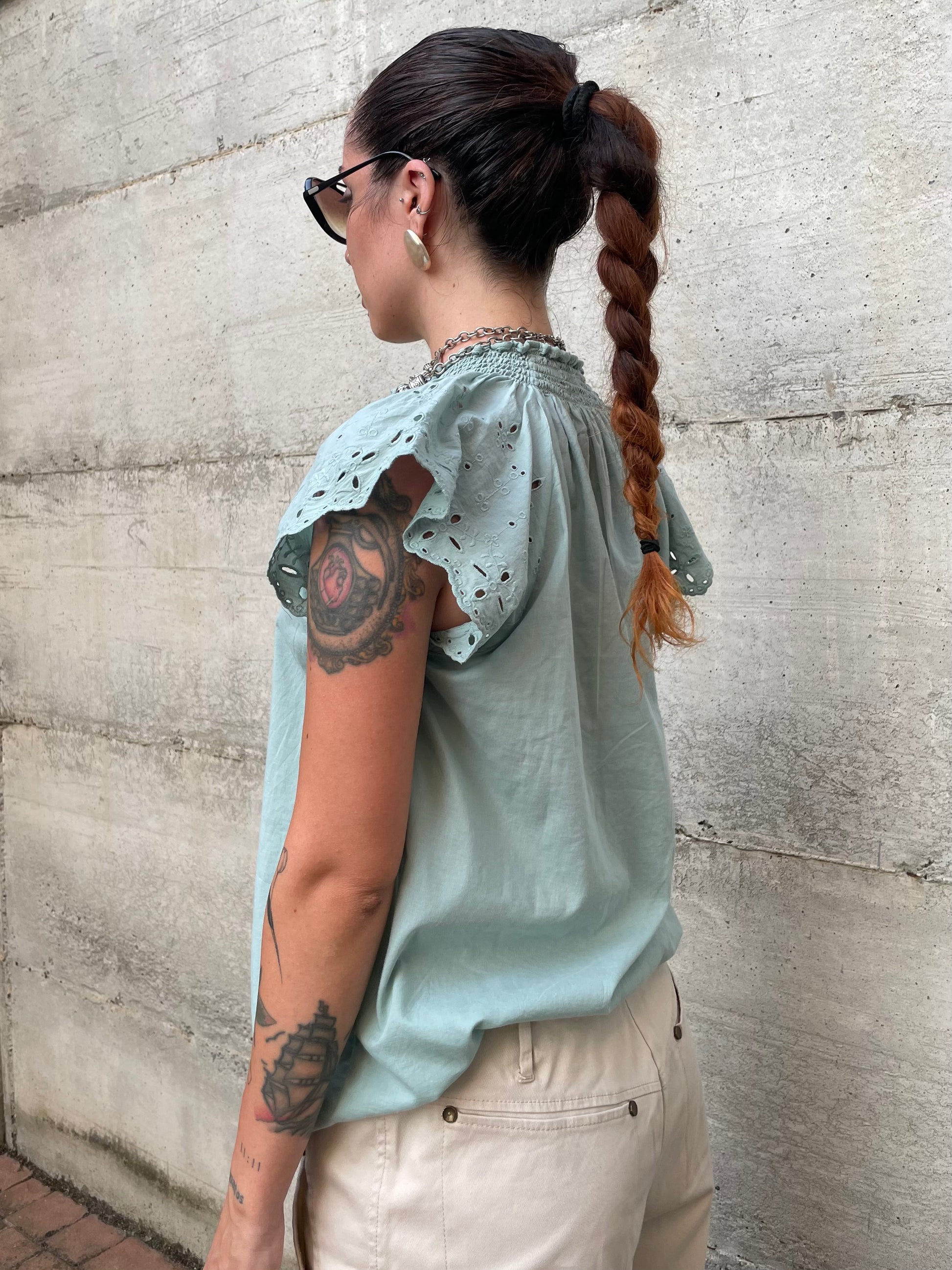 Top con manica corta volant 100% cotone sangallo, turchese.