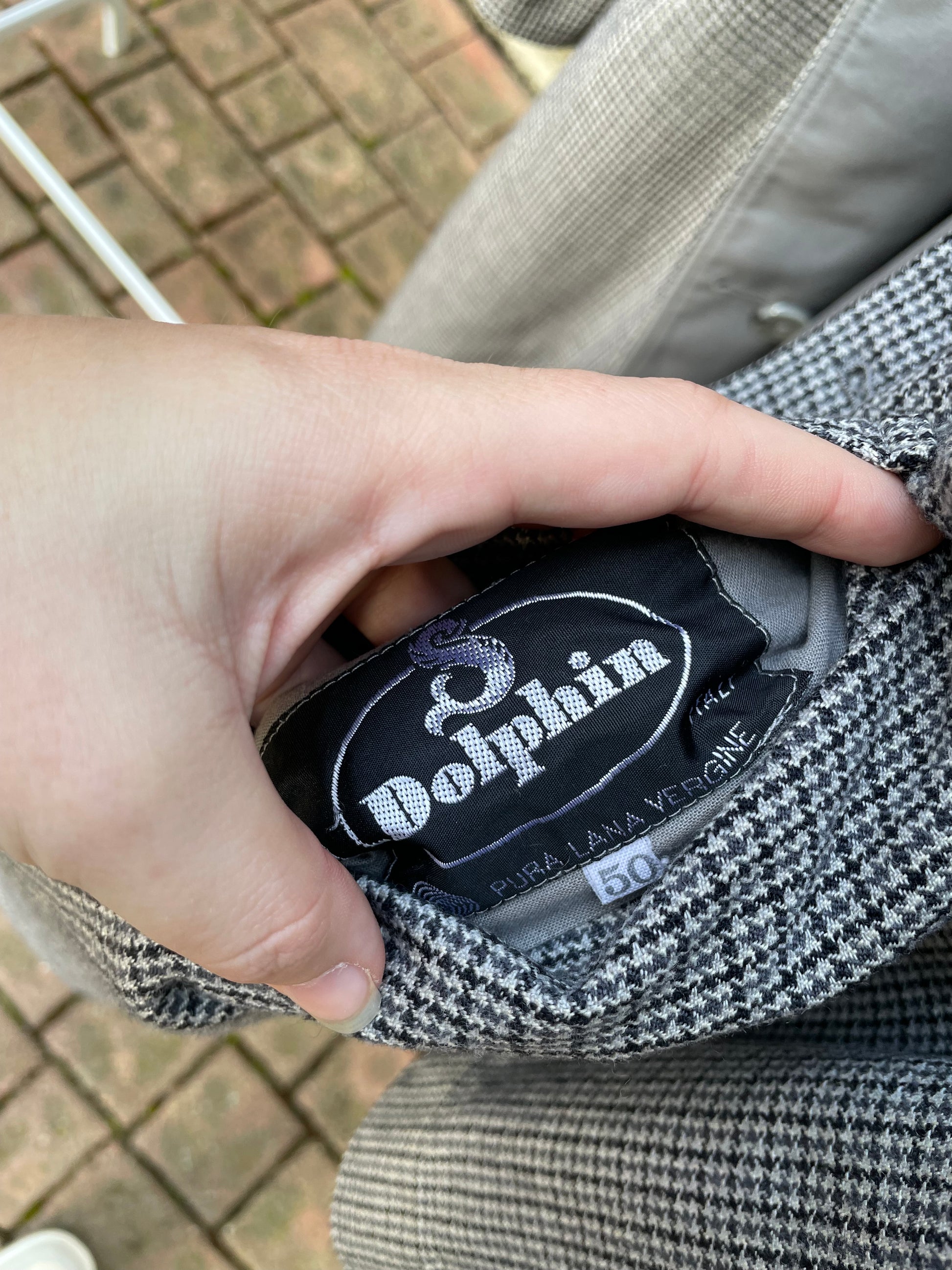 Trenchcoat/cappotto Nino monopetto double face, da un lato in pura pura lana vergine fantasia pied de poule, dall'altro impermeabile in misto cotone e poly grigio.