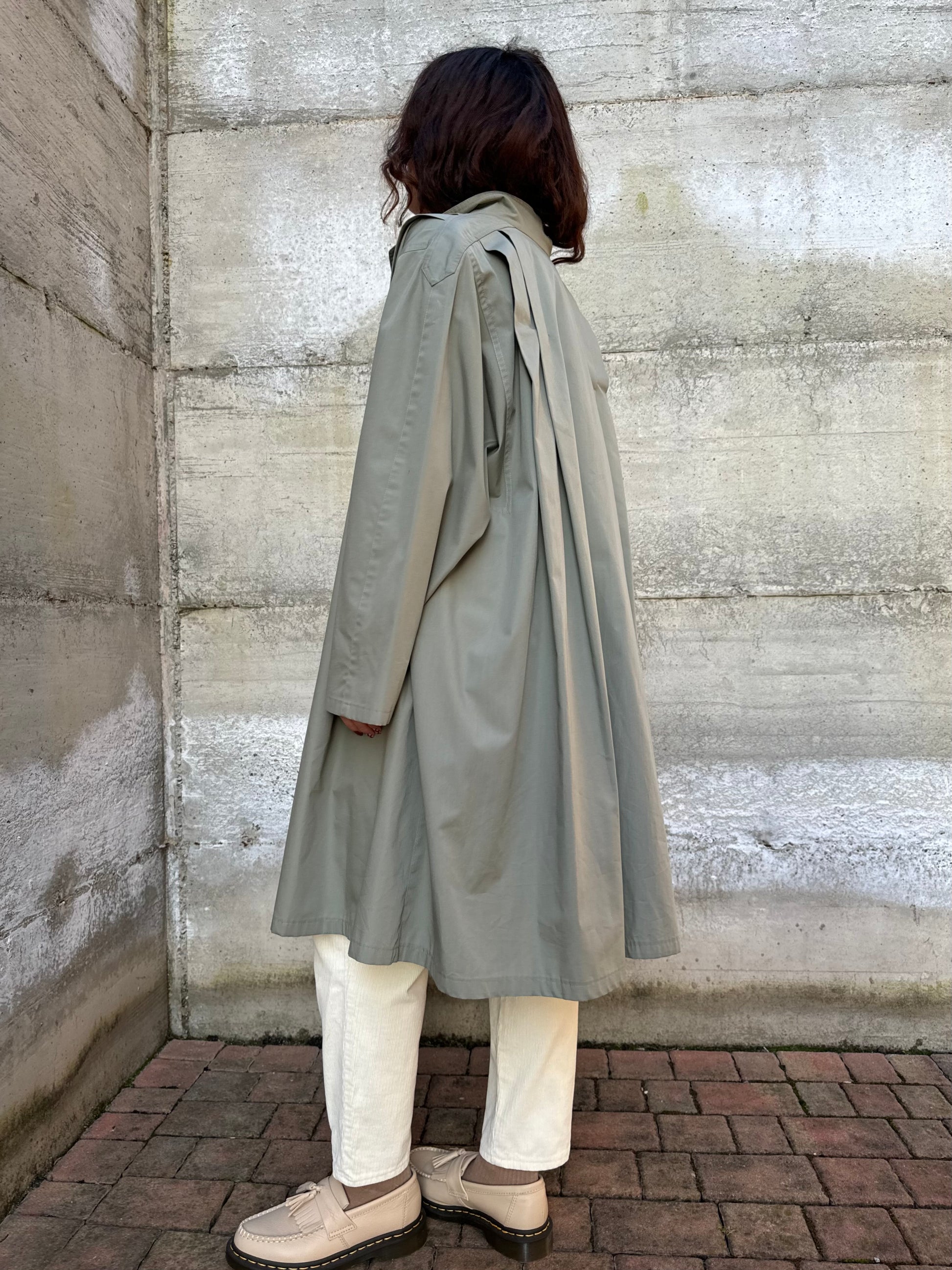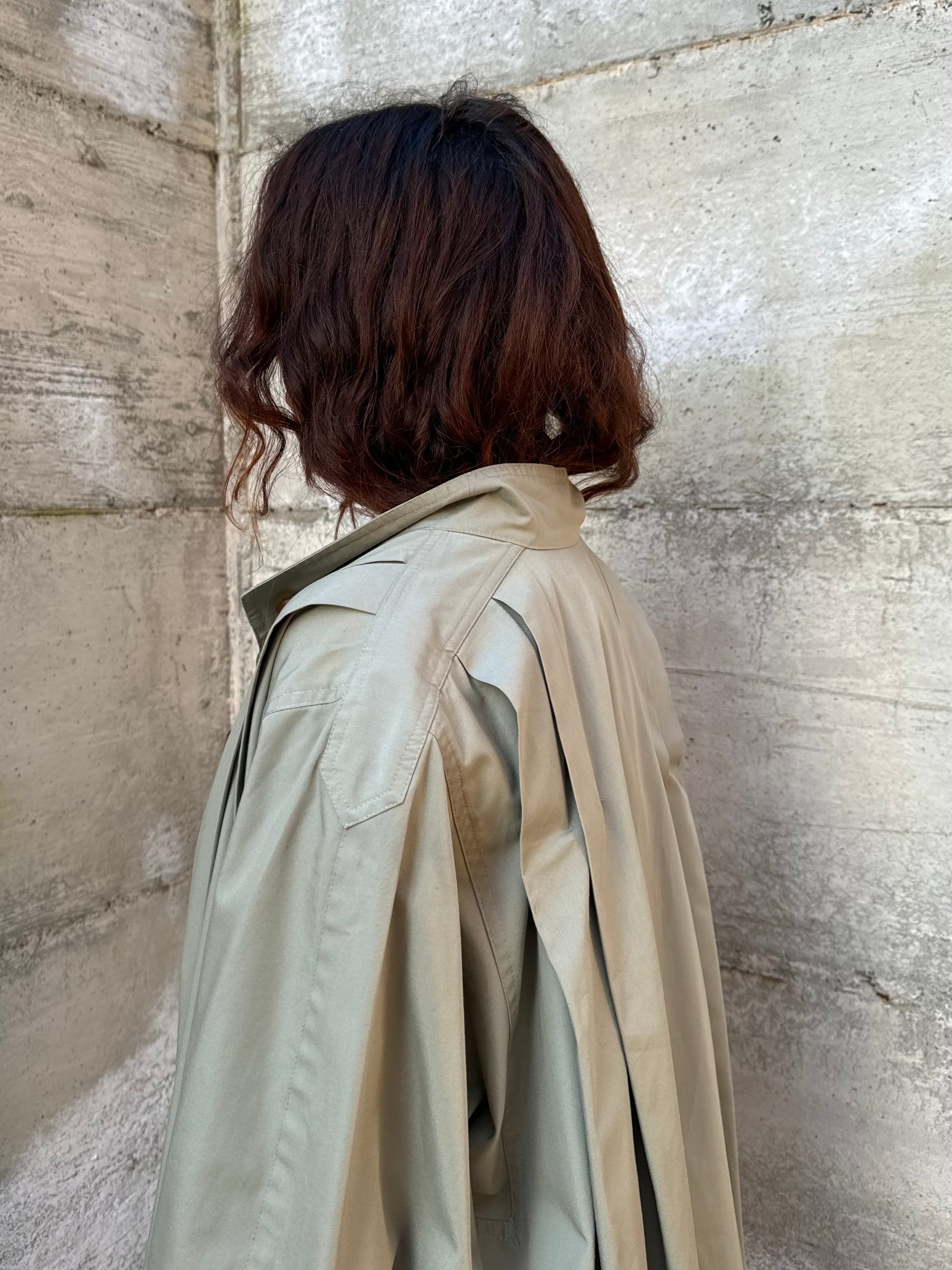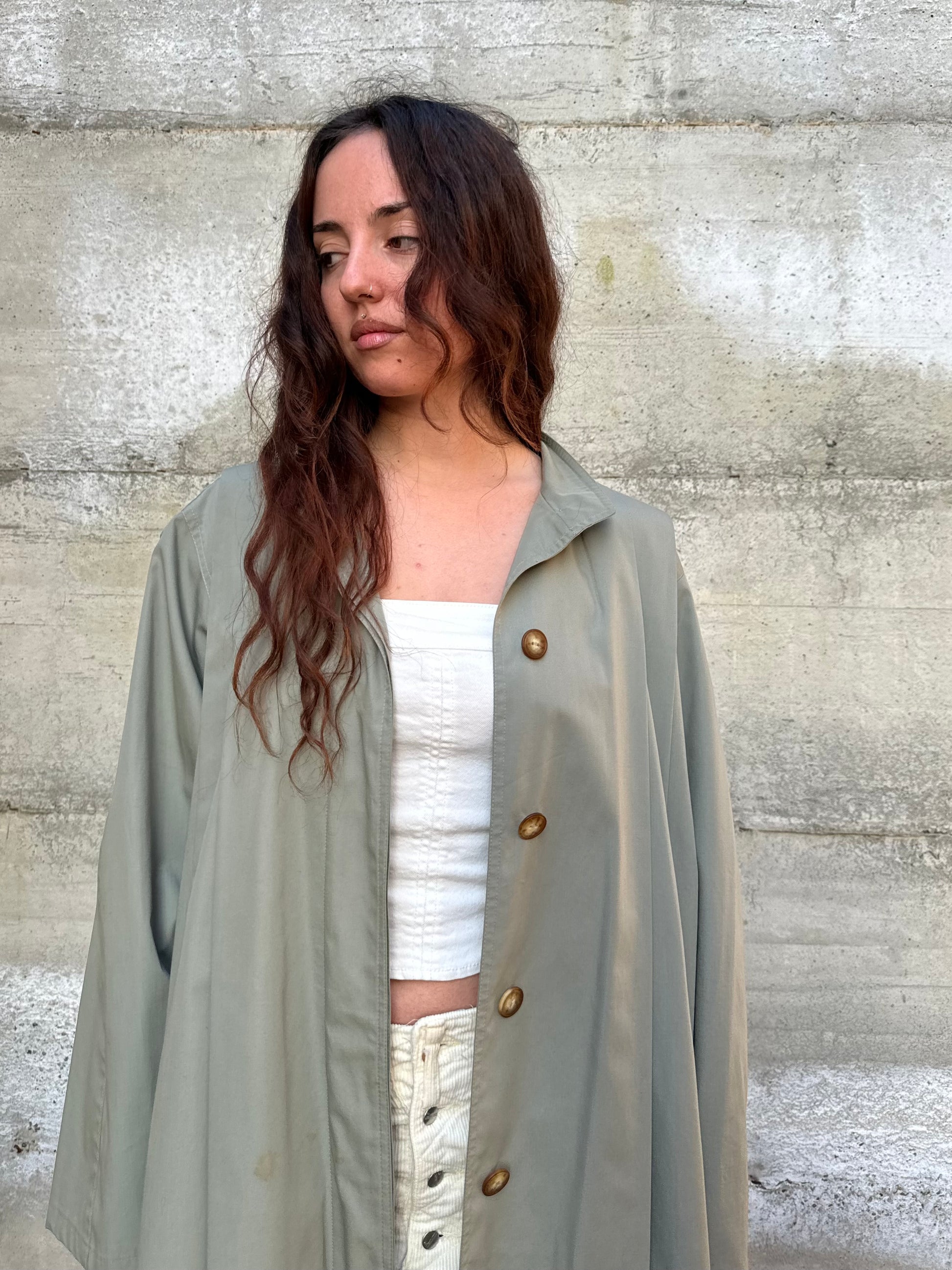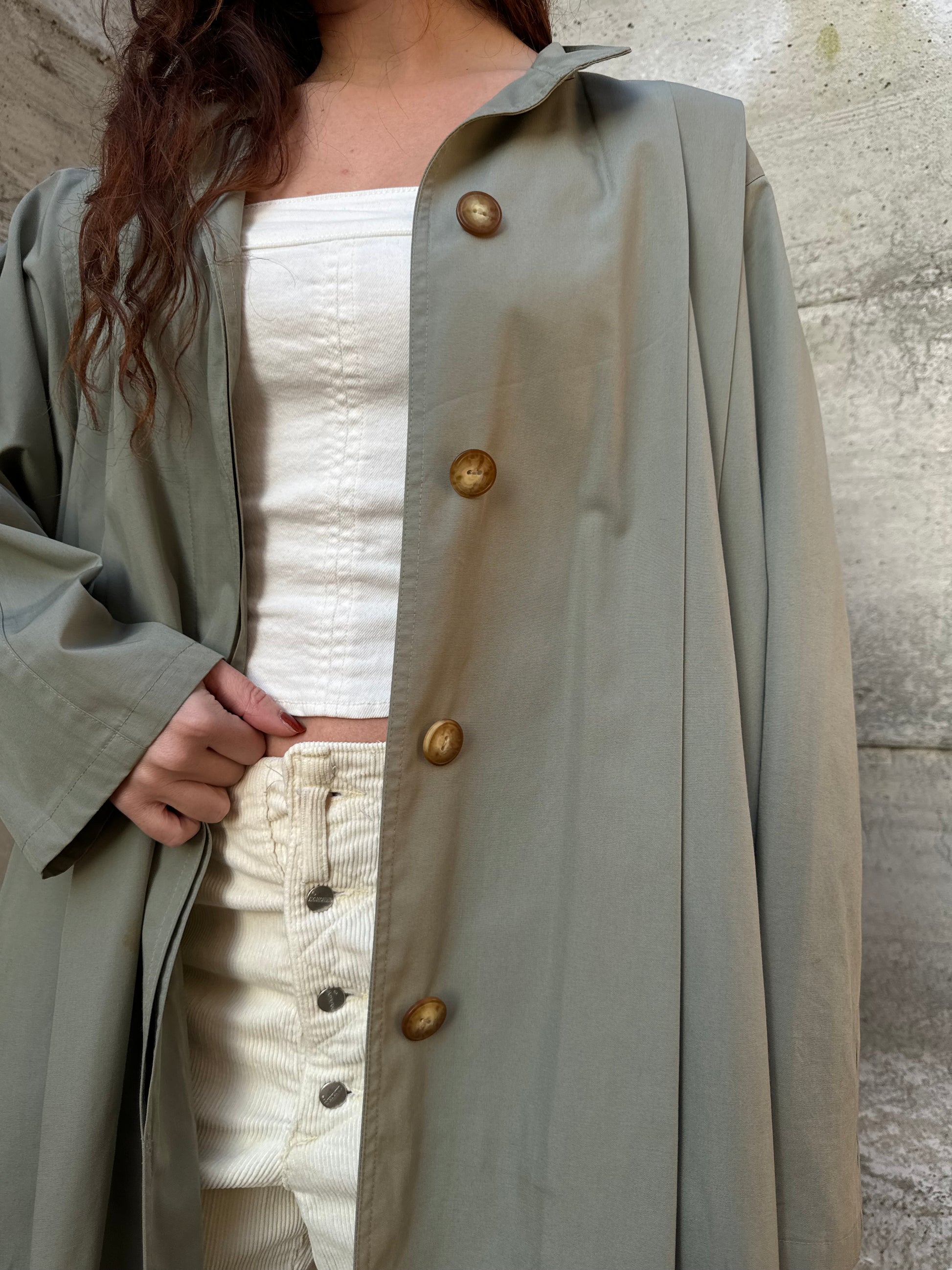 Verde salvia, monopetto, con colletto alla coreana e bottoni a contrasto.