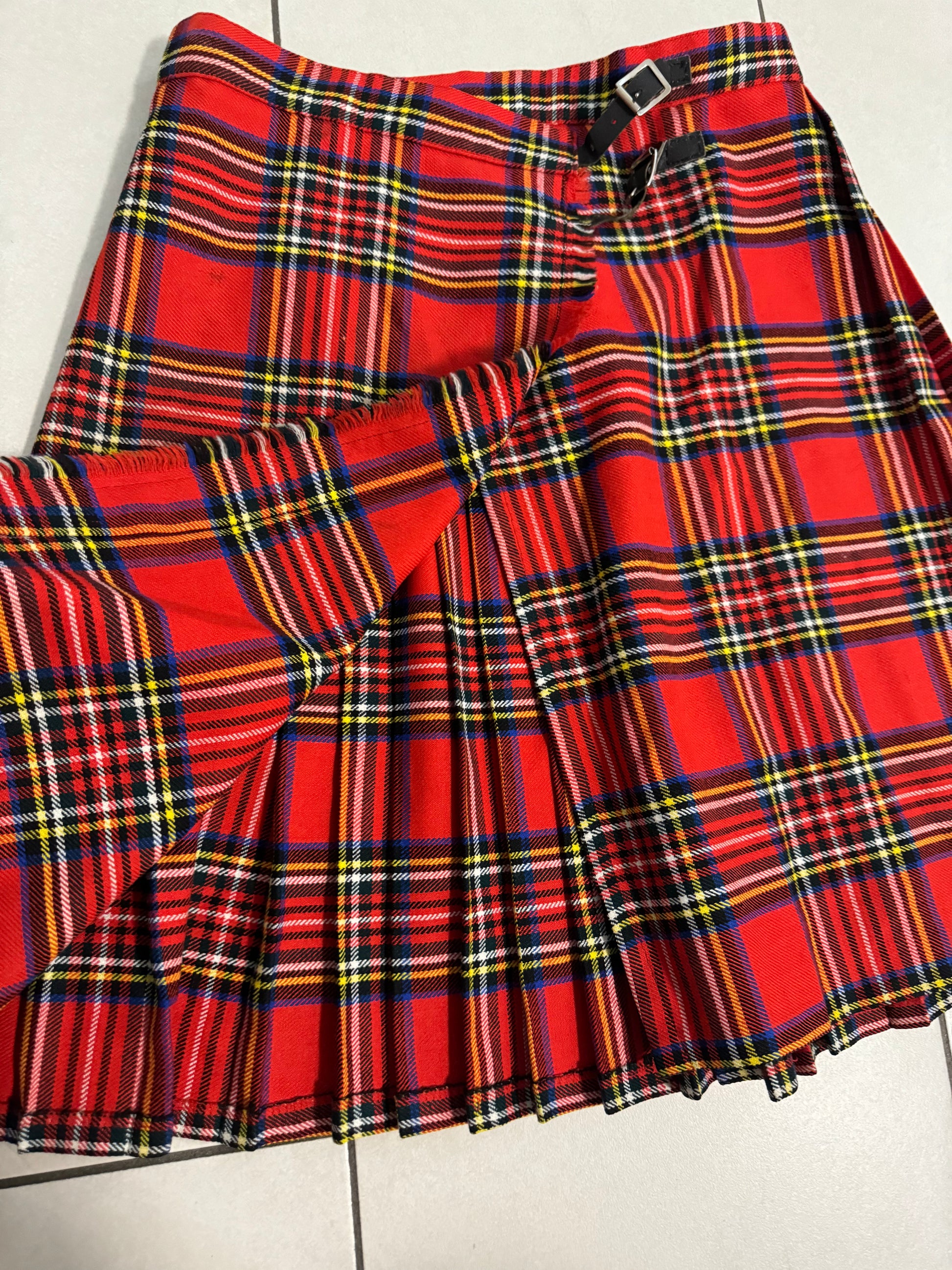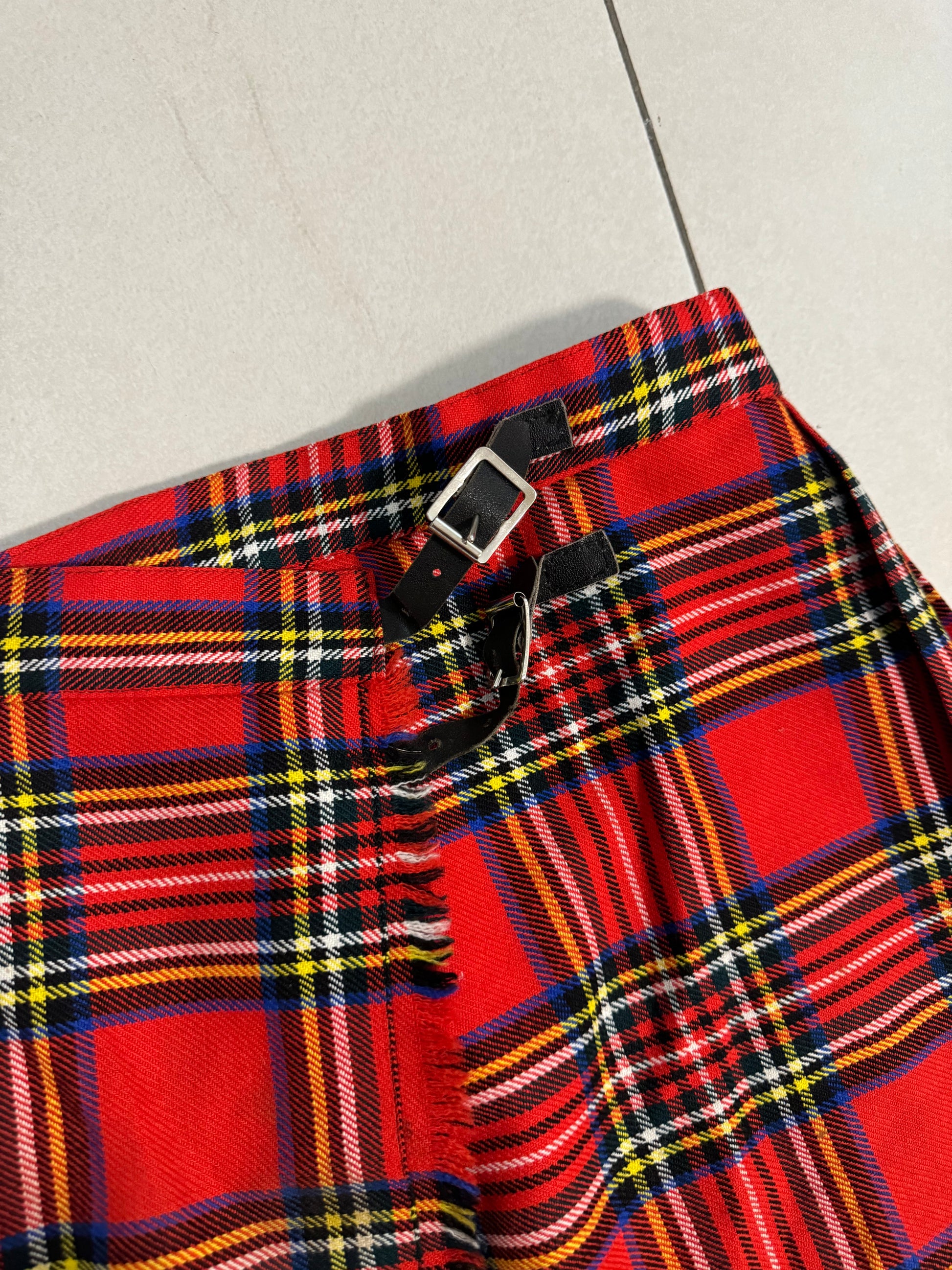 Kilt midi sartoriale in fresco lana, chiusura a portafoglio con fibbiette, taglia regolabile.