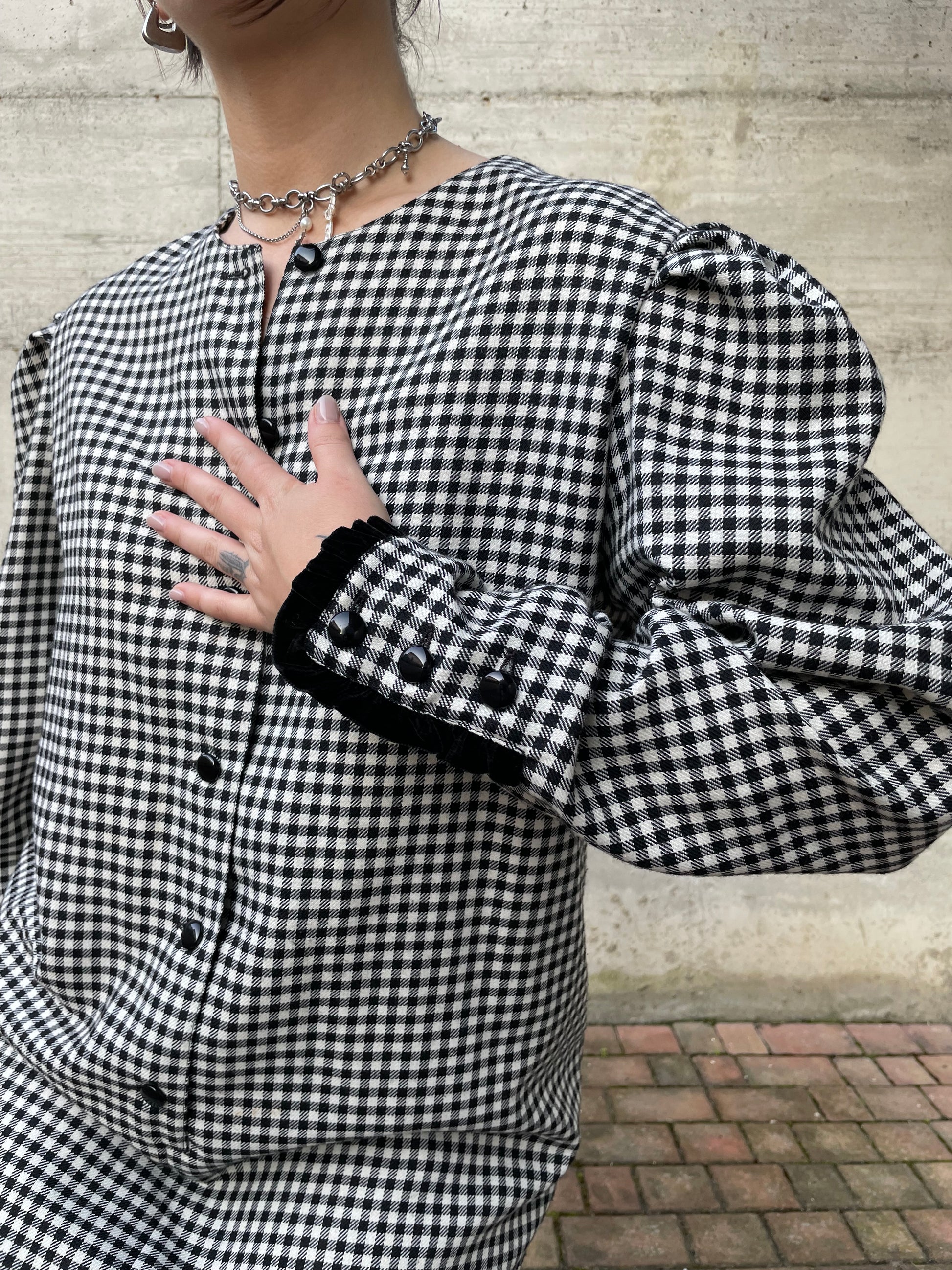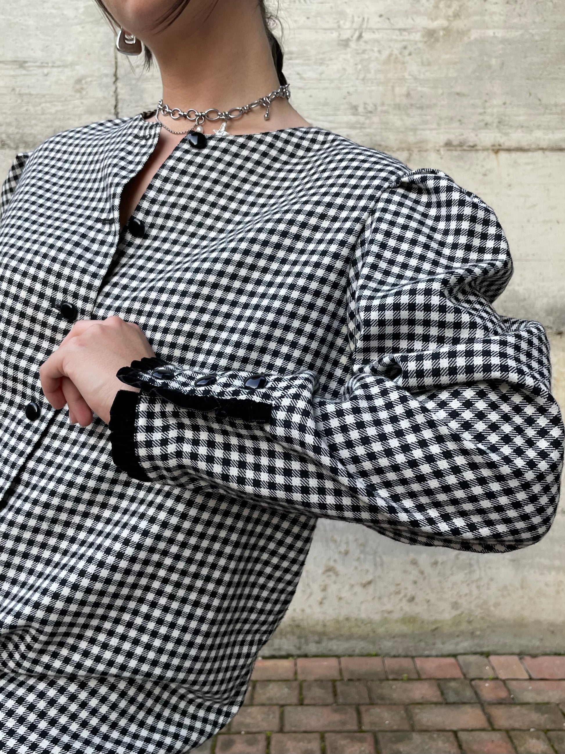 Manica a sbuffo, polsini con bottoncini e bordino in velluto, chisura con bottoni frontali.